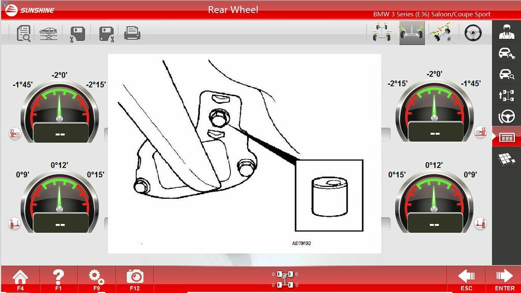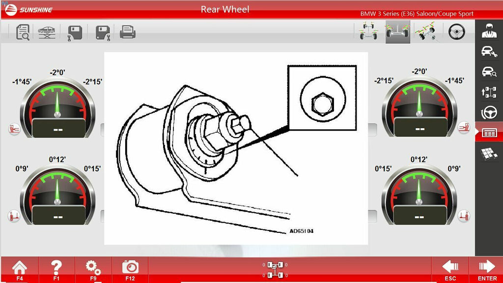- Doplnkové funkcie: správa o stave vozidla, meranie pri zdvihnutom vozidle, nastavenie bez kolesa (so špeciálnymi adaptérmi)