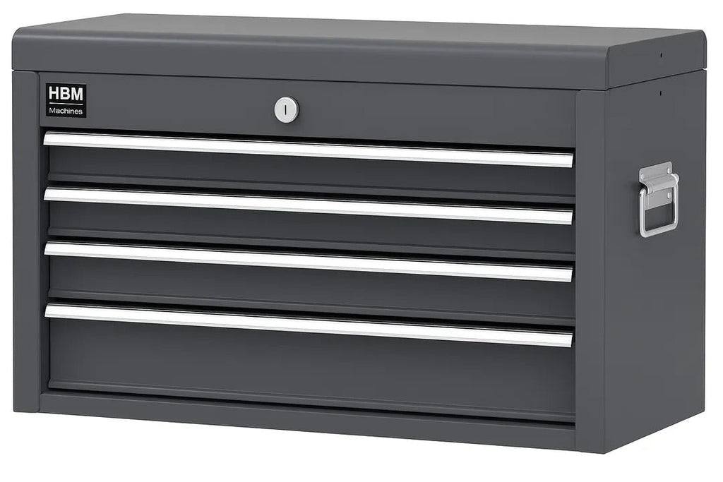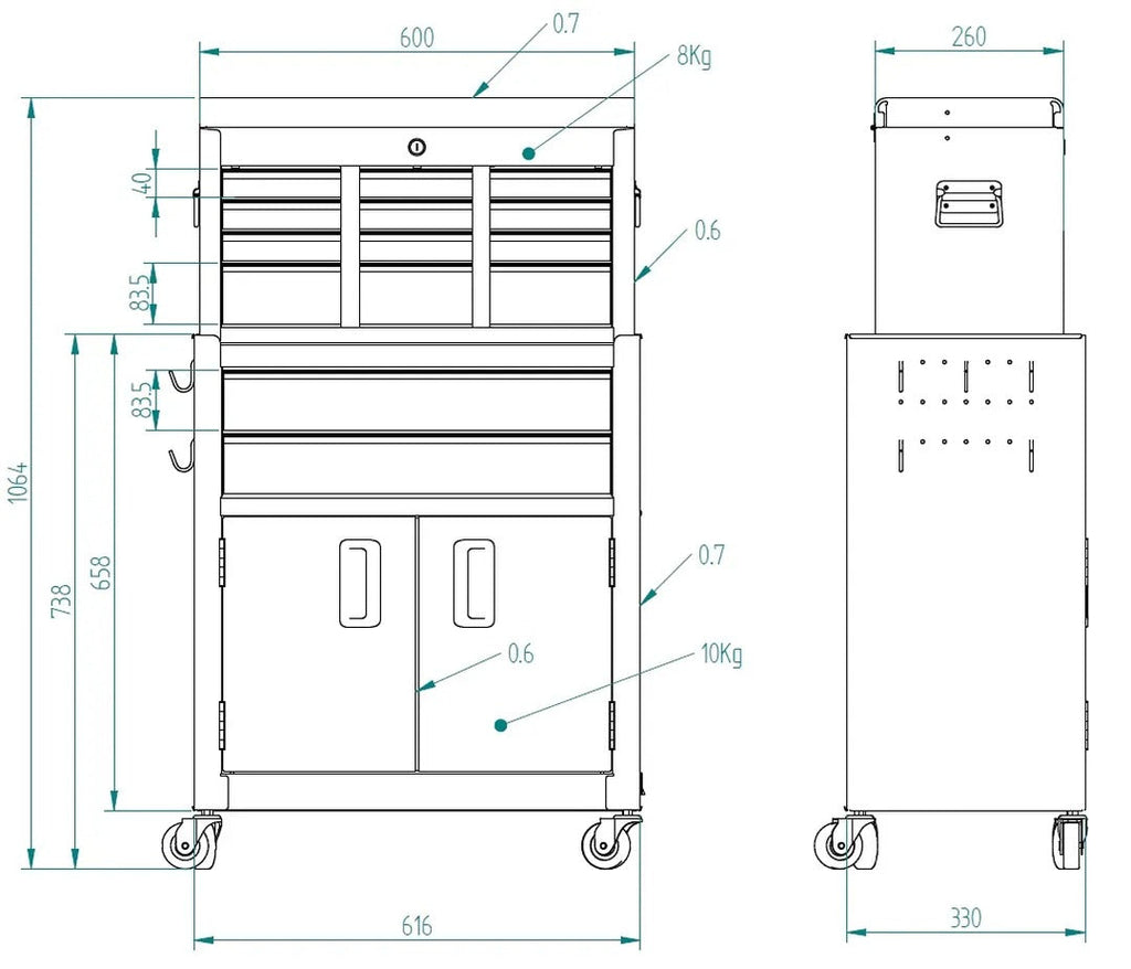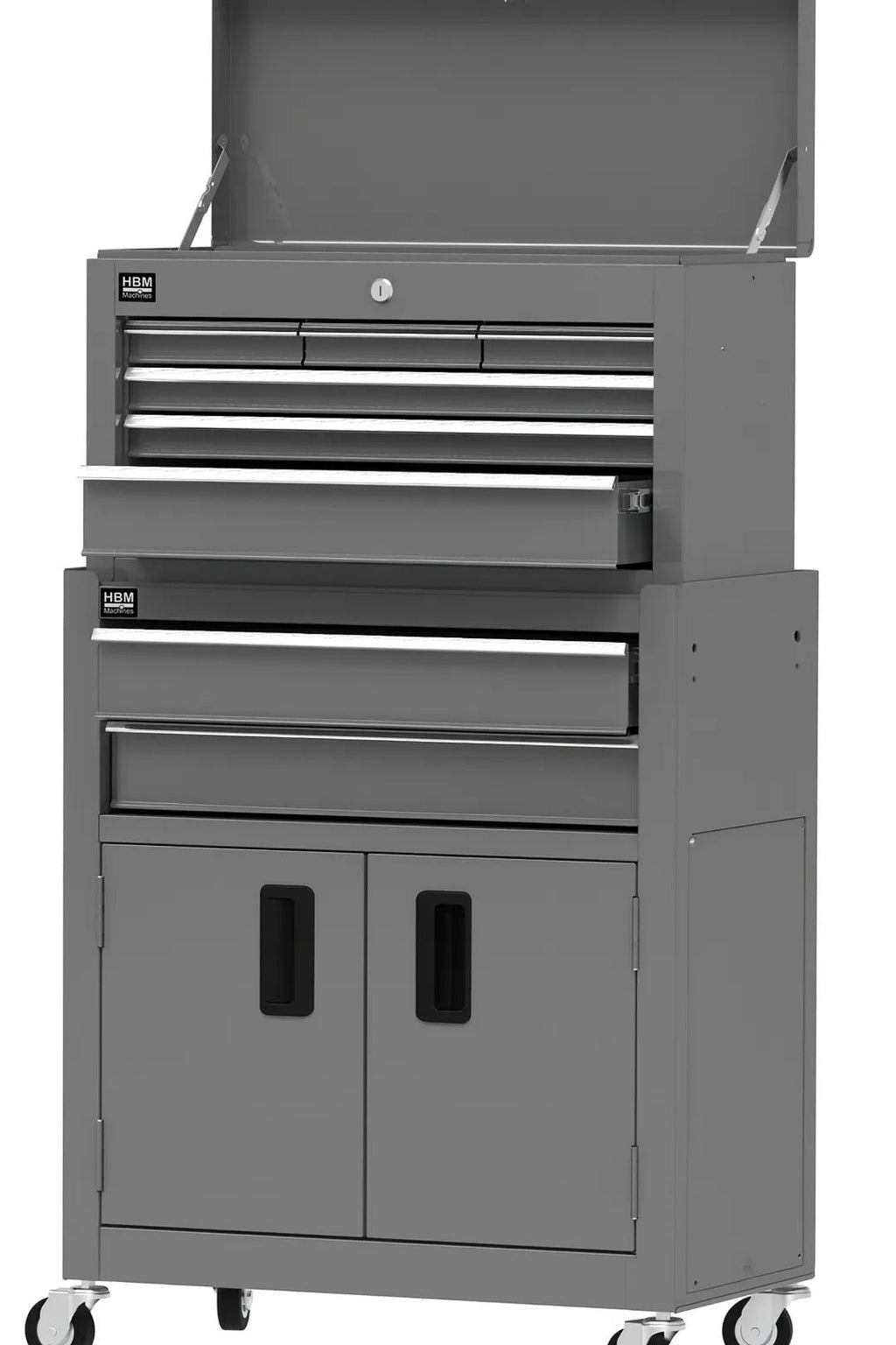 KOVOVÁ SKRIŇA NA NÁRADIE, 2 DIELY, 8 ZÁSUVIEK, SIVÁ – HBM, PREMIUM, HOLANDSKO sa skladá z dvoch častí, mobilnej skrine na náradie a hornej skrinky menších rozmerov. Horná malá skriňa má 6 zásuviek a spodná má dve priestranné zásuvky. Farba skriniek je sivá a sú vyrobené z kovu. Celý komplet sa dá ľahko premiestniť vďaka bočnej rukoväti a kolieskam. Celkové rozmery sú 61.6 x 33 x 106.4 cm. Celková hmotnosť výrobkov je 35 kg.