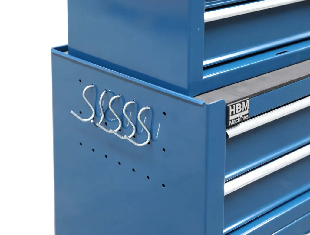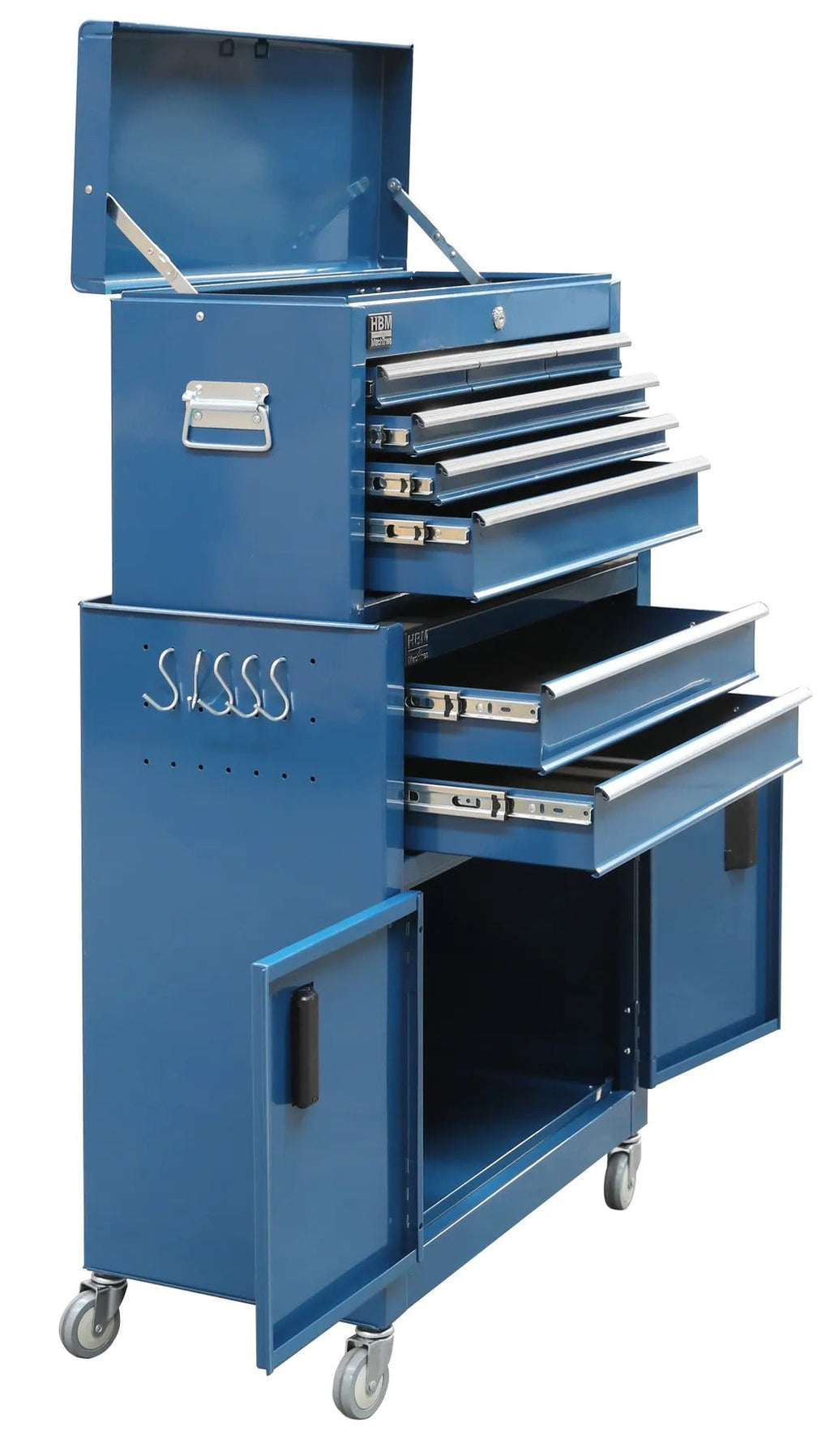 TÁTO KOVOVÁ SKRIŇA NA NÁRADIE PREMIUM, 2 DIELY, 6 ZÁSUVIEK A 2 DVERE, MODRÁ, HBM, HOLANDSKO, 61,4 X 33 X 106,4 CM sa skladá z 2 častí a predstavuje praktické a trvácne riešenie pre organizáciu náradia a príslušenstva v dielňach, garážach alebo profesionálnych pracovných priestoroch.