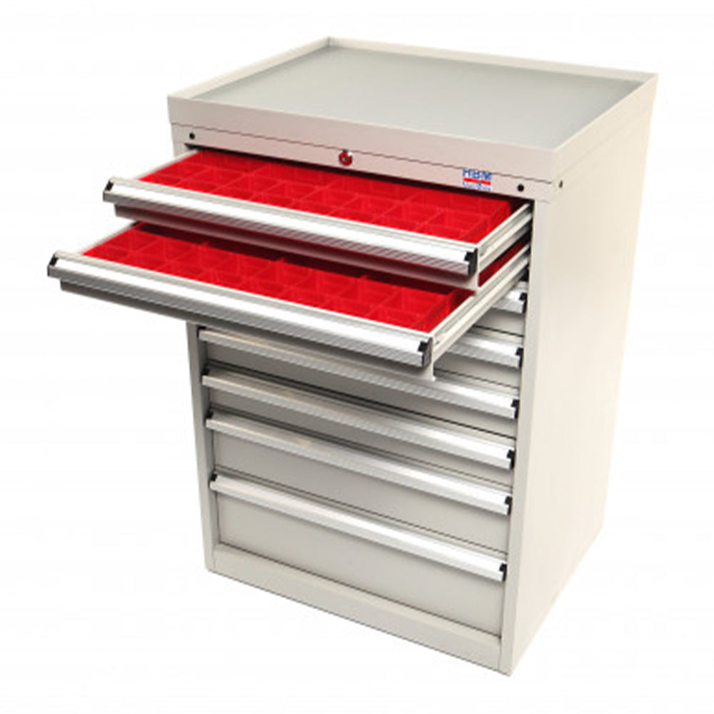 - Táto skrinka na náradie obsahuje: 32x tácky 75 x 75 mm, 16x tácky 75 x 150 mm, 8x tácky 150 x 150 mm, 12x priehradky, 32x oddeľovače, 1x pracovný list