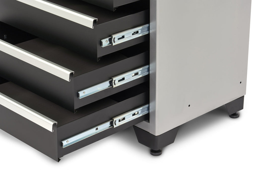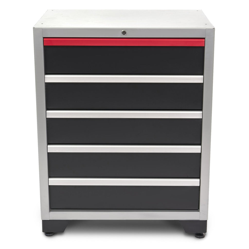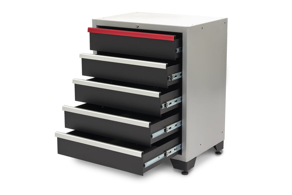 TÁTO SKRIŇA S 5 ZÁSUVKAMI PRE SERVISNÚ DIELŇU je pevná zváraná konštrukcia, ktorá nevyžaduje montáž. Pomocou našich výrobkov si môžete zostaviť skriňu tak veľkú, ako potrebujete. Čo je presne vhodné pre vašu dielňu a pretože je veľmi pekná, dodáva dielni oveľa profesionálnejší vzhľad. Steny systému sú v metalickej sivej (striebornej) farbe. Zásuvky a dvere sú v matnej čiernej farbe a úchyty a horné dvierka zásuviek sú vždy vyrobené z krásneho profilu z červeného eloxovaného hliníka, ktorý tomuto systému skríň dodáva veľmi sofistikovaný a elegantný vzhľad.