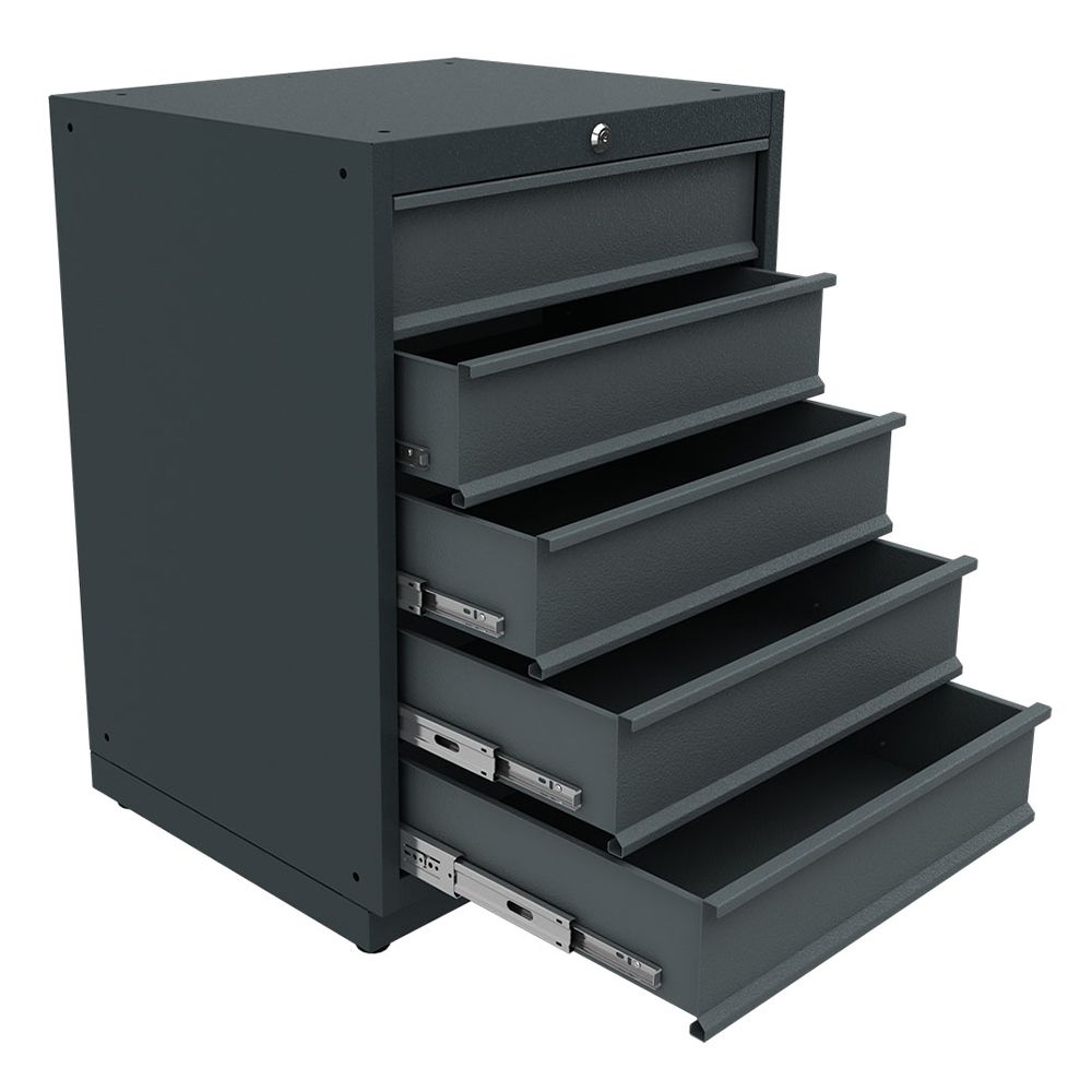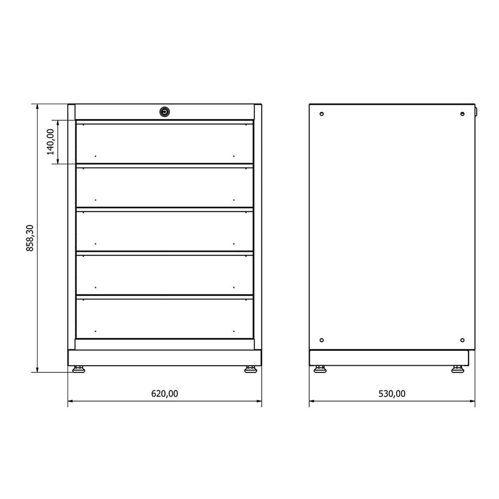 TÁTO SKRIŇA S 5 ZÁSUVKAMI PRE DIELŇU 62 X 53 X 86 CM je vybavená piatimi pevnými zásuvkami, ktoré sa úplne vysúvajú a sú vybavené koľajničkami s guľkovými ložiskami. Všetky zásuvky je možné uzamknúť centrálne pomocou cylindrického zámku.