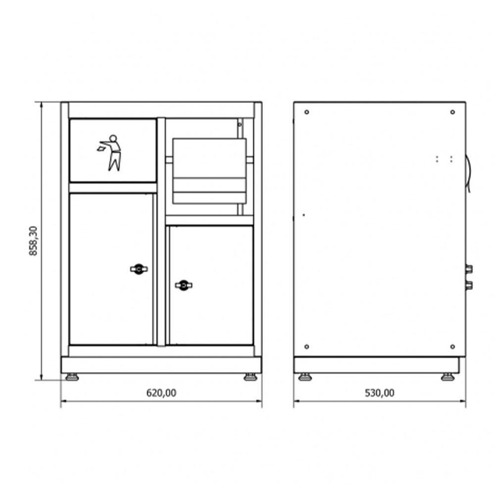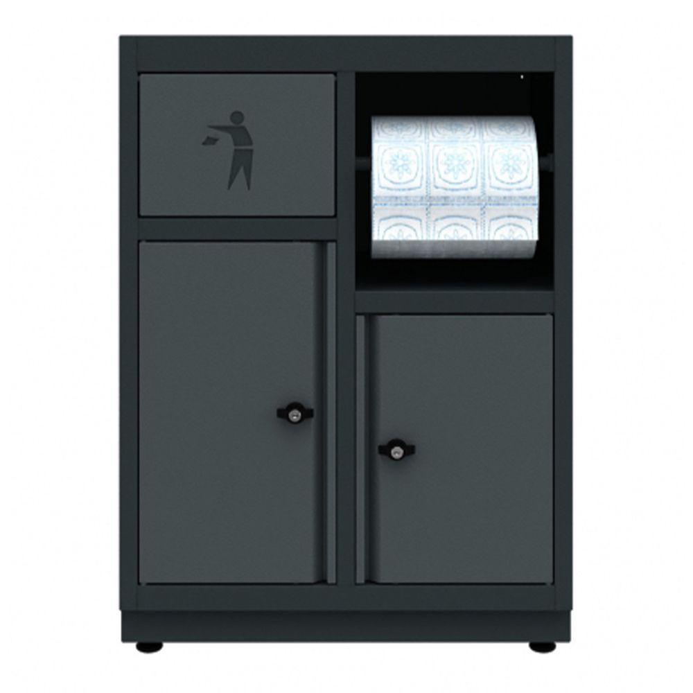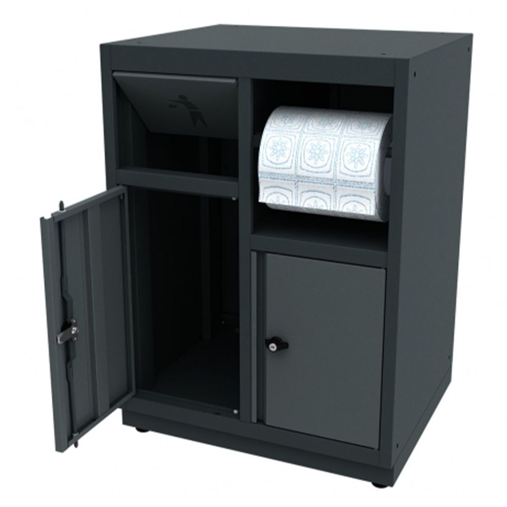 TÁTO DIELENSKÁ SKRIŇA SO STOJANOM NA PAPIER A ODPADKOVÝM KOŠOM 62 X 53 X 86 CM pozostáva z odpadkového koša, ktorý možno uzavrieť cylindrickým zámkom, police so stojanom na papier a spodných dvierok, ktoré možno taktiež uzamknúť cylindrickým zámkom.