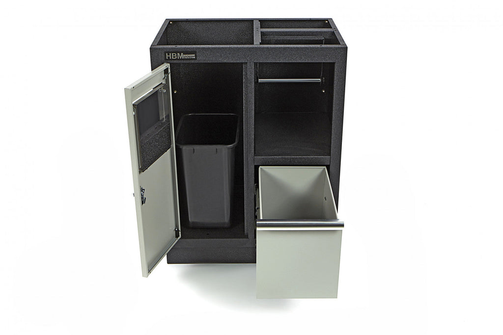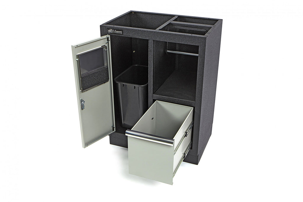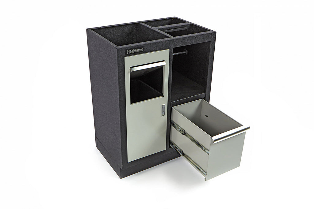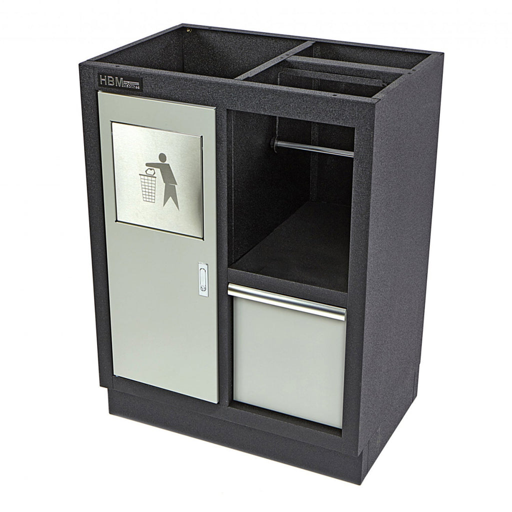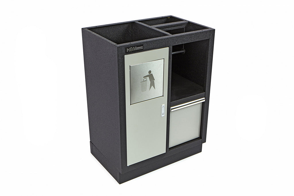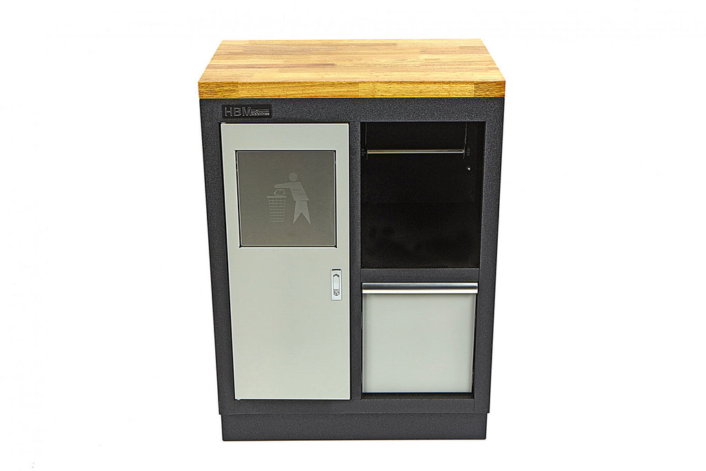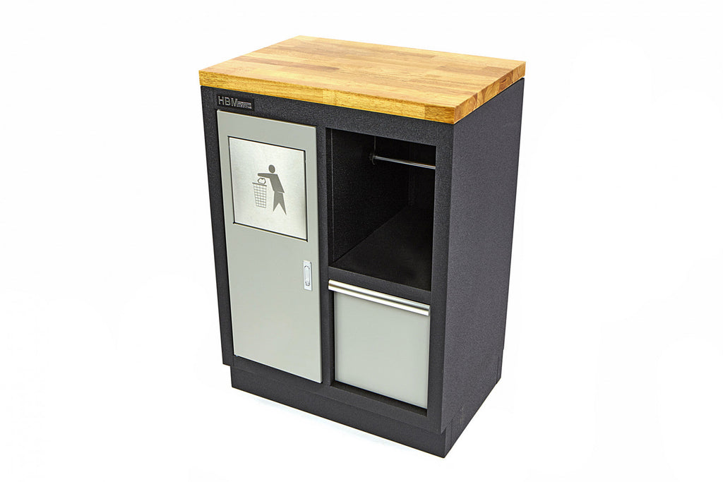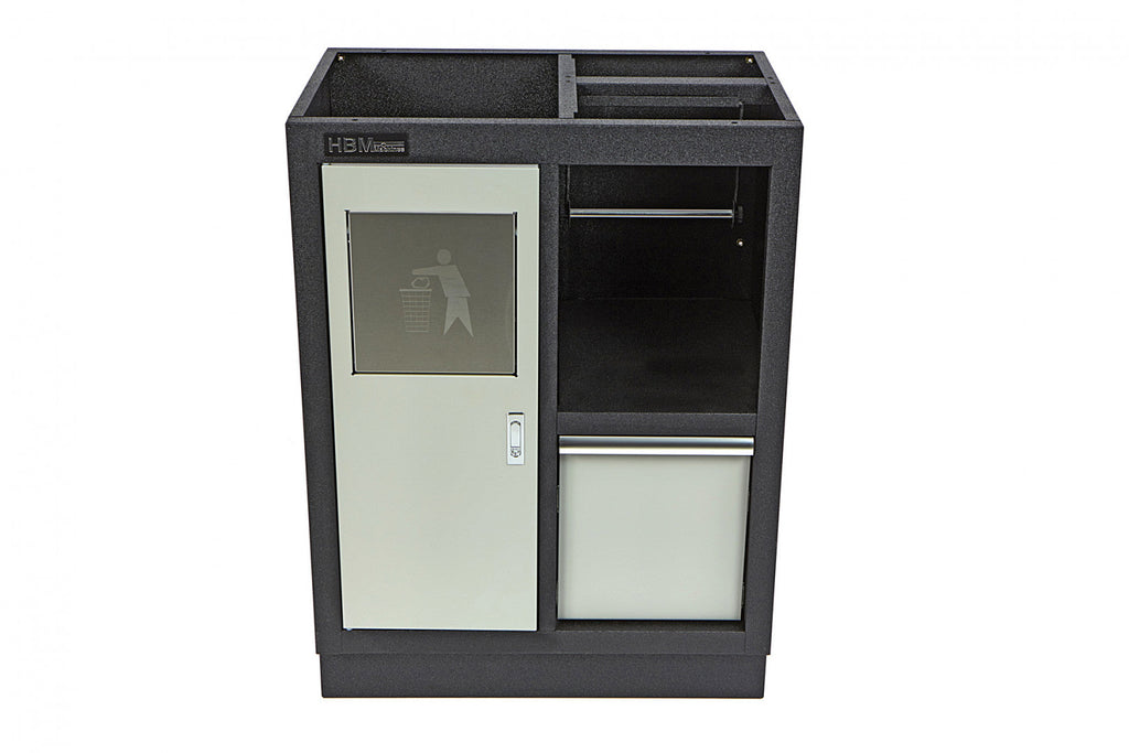 TÁTO DIELENSKÁ SKRIŇA SO STOJANOM NA PAPIER A ODPADKOVÝM KOŠOM HBM je multifunkčný produkt, pretože má odpadkový kôš, zásuvku a držiak na papierové role a je vhodná do dielne alebo garáže.