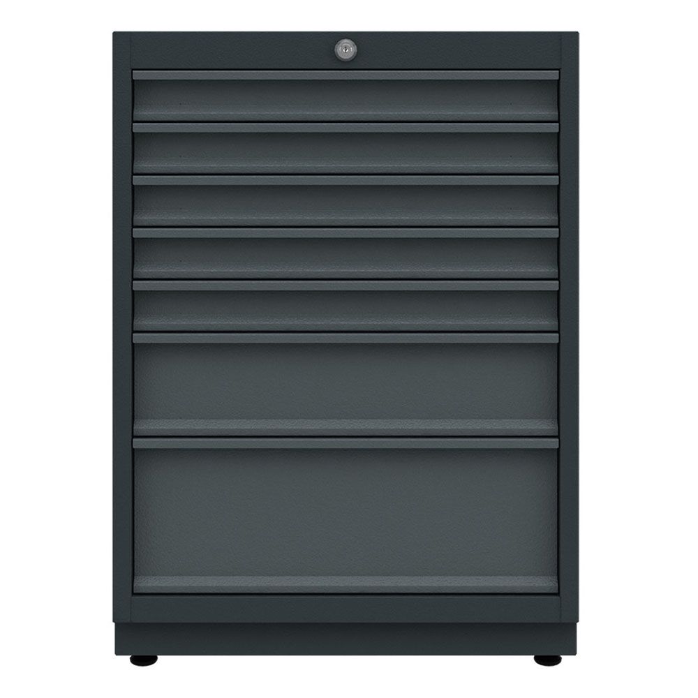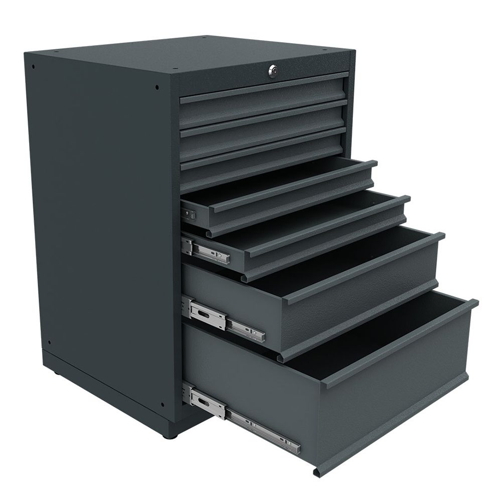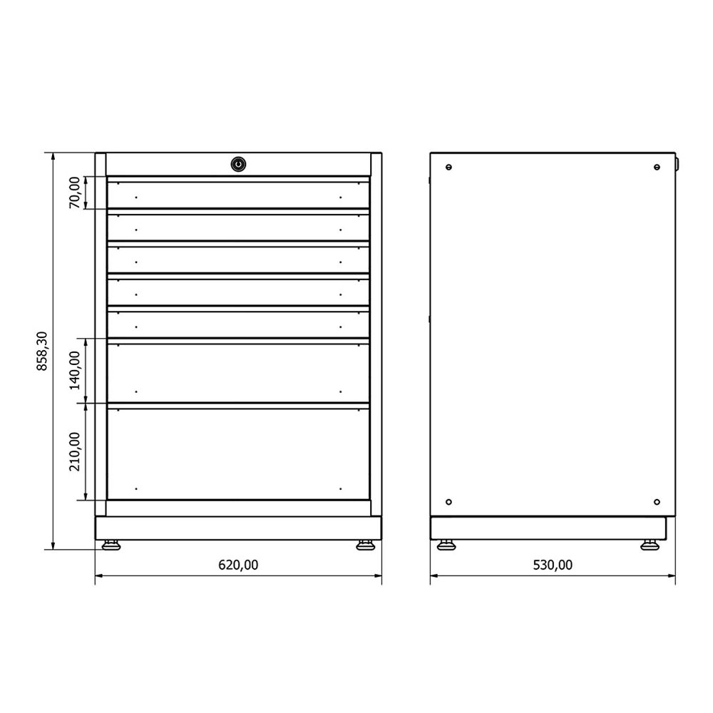 TÁTO SKRIŇA SO 7 ZÁSUVKAMI PRE DIELŇU 62 X 53 X 86 CM má sedem pevných zásuviek, ktoré sa úplne vysúvajú a sú vybavené koľajničkami s guľkovými ložiskami. Všetky zásuvky je možné uzamknúť centrálne pomocou cylindrického zámku.
