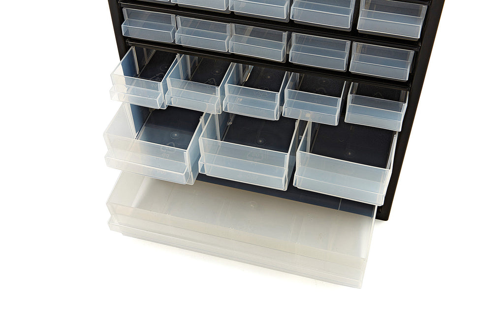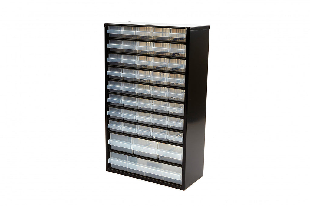 KOVOVÝ ÚLOŽNÝ BOX SO 44 ZÁSUVKAMI je dodávaný v 3 rôznych veľkostiach, vhodný na uskladnenie rôznych predmetov. Zásuvky sú vyrobené z polypropylénu.