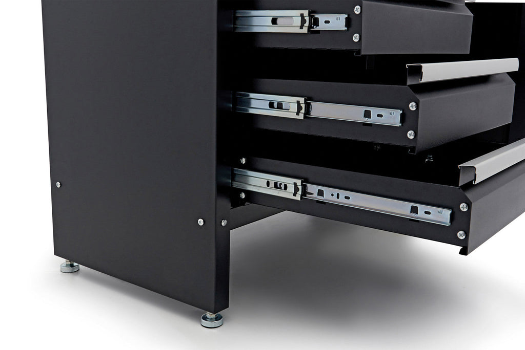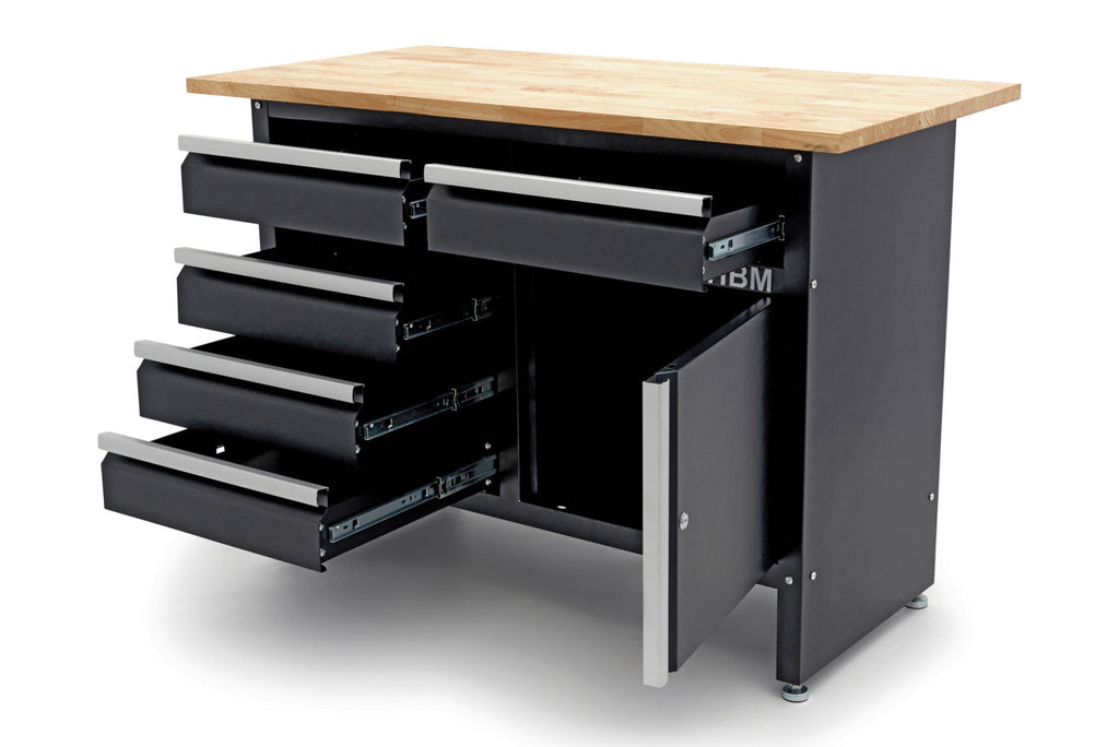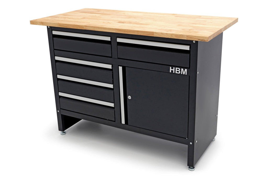 TENTO KOVOVÝ PRACOVNÝ STÔL 120 CM S 5 ZÁSUVKAMI, 1 DVIERKAMI A MASÍVNOU DREVENOU DOSKOU HBM ponúka robustný a univerzálny pracovný priestor pre rôzne aplikácie v dielňach, garážach alebo komerčných pracoviskách. Vyrobený z odolnej ocele, tento pracovný stôl zaisťuje stabilitu a dlhodobú odolnosť, čo umožňuje používateľom vykonávať rôzne pracovné činnosti bez problémov.