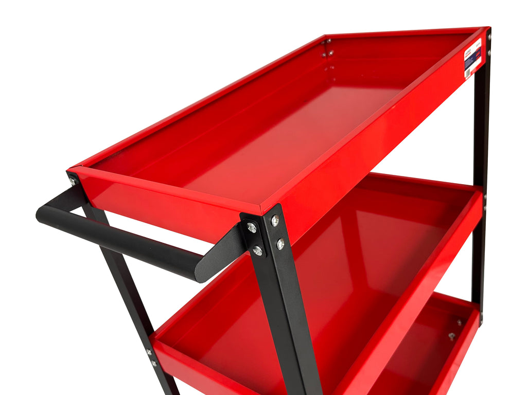Tri police vozíka poskytujú dostatok priestoru na uloženie a prepravu rôznych predmetov, ako je náradie, zariadenia, škatule, materiály alebo akýkoľvek iný typ nákladu vhodný pre veľkosť a kapacitu vozíka. Vďaka mobilnému dizajnu ho možno ľahko presúvať do rôznych zón alebo miestností, čo ponúka flexibilitu a dostupnosť pri skladovaní alebo organizácii.