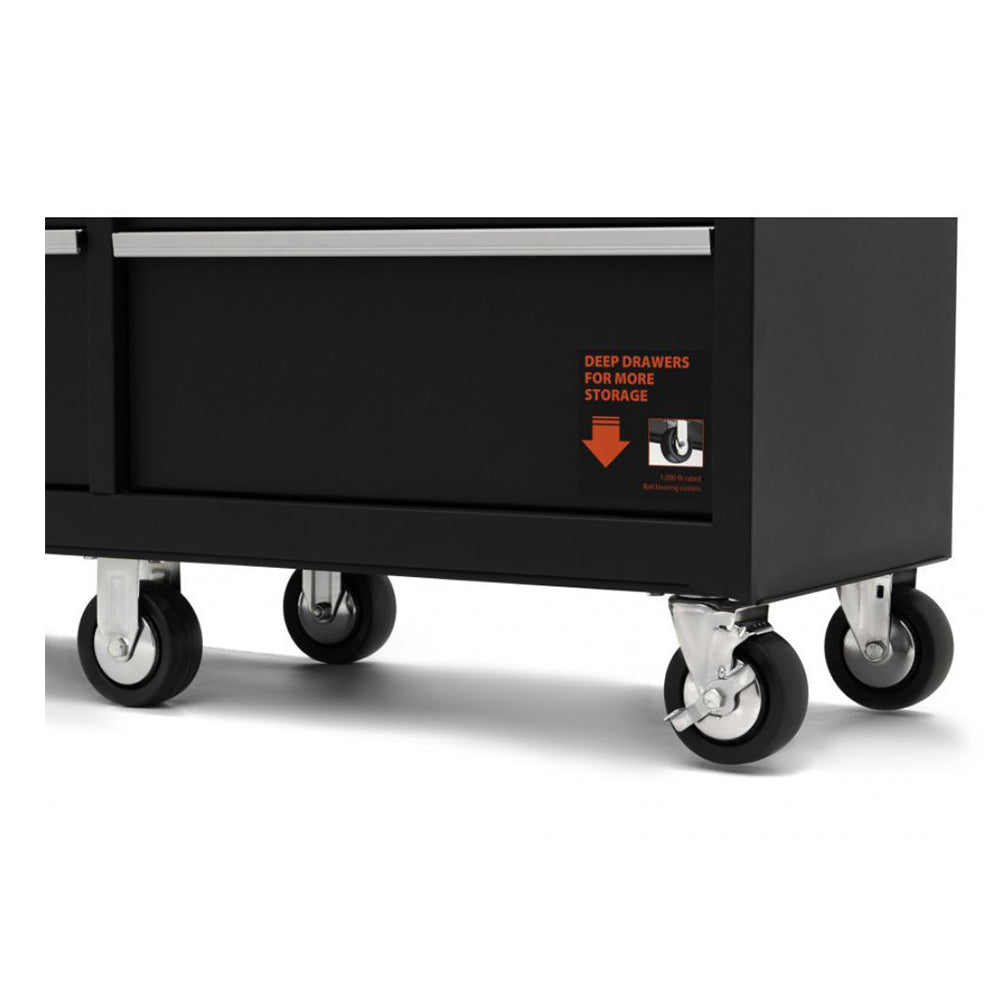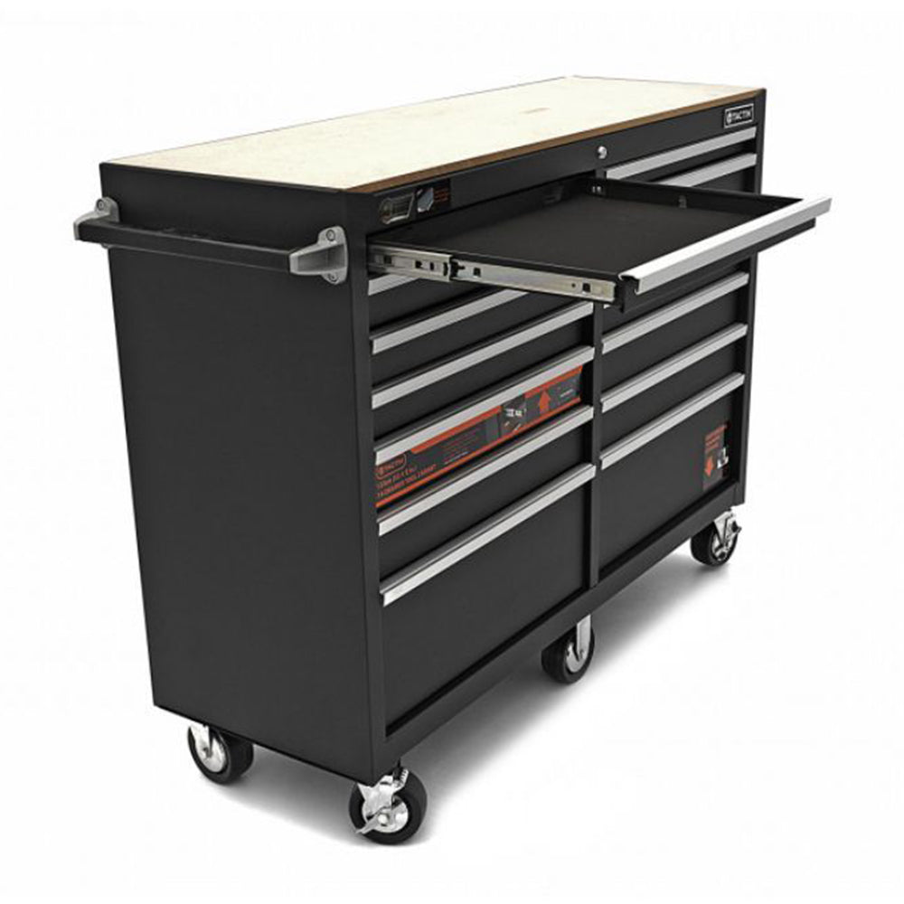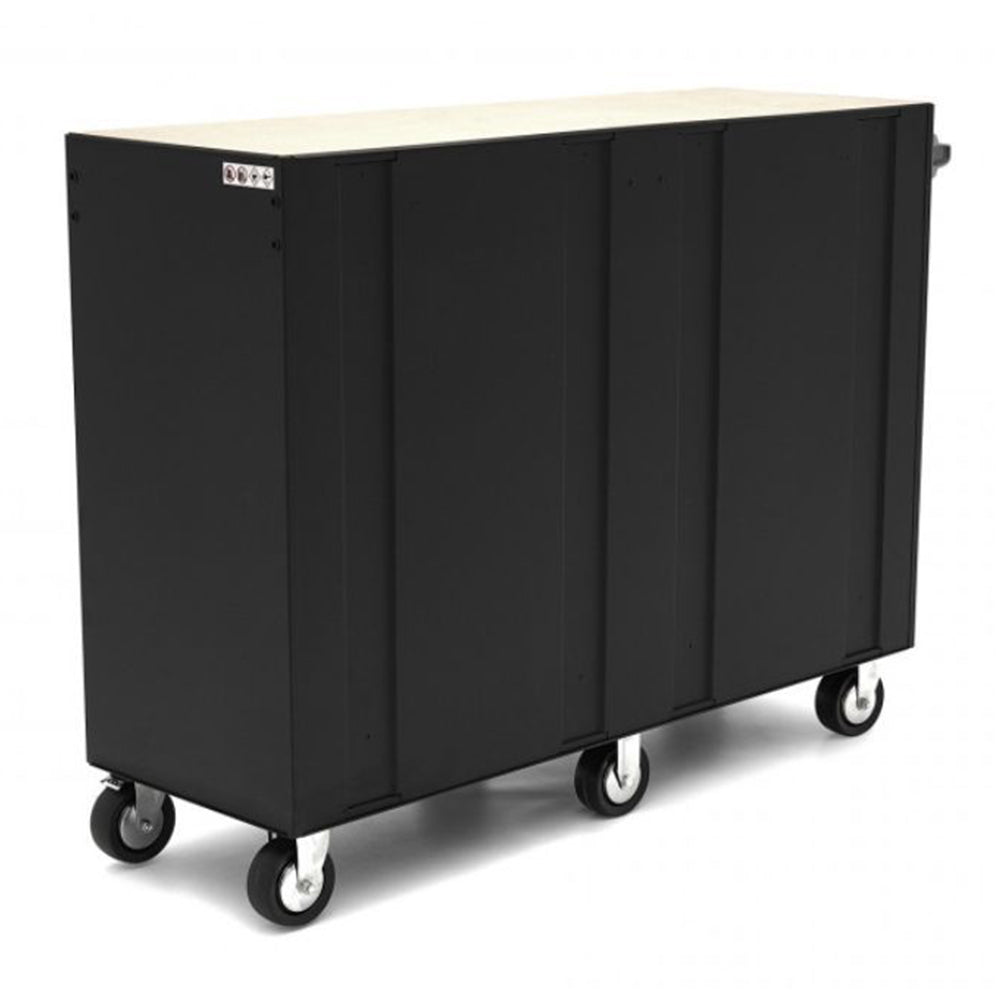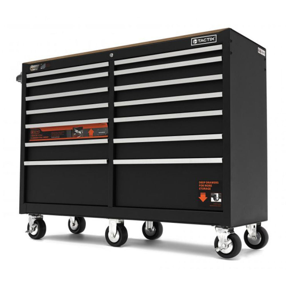 TÁTO SKRIŇA NA NÁRADIE S PRACOVNÝM STOLOM SO 14 ZÁSUVKAMI 133CM je vhodný produkt pre dielňu alebo garáž, pretože sa dá použiť ako pracovný stôl a náradie sa dá uložiť do zásuviek. Skriňa je vybavená 2 otočnými kolieskami s brzdami a 2 pevnými kolieskami.