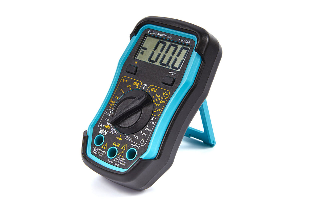TENTO DIGITÁLNY MULTIMETER HBM má veľmi pevnú konštrukciu, LCD displej s vysokým kontrastom a skladaciu opierku, pomocou ktorej je možné multimeter postaviť do naklonenej polohy.