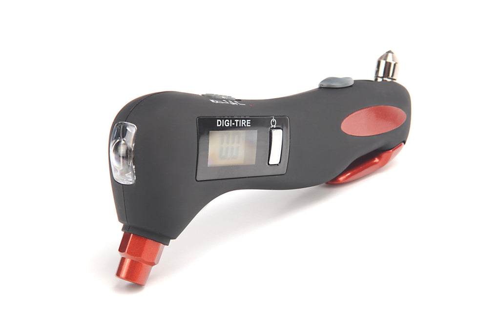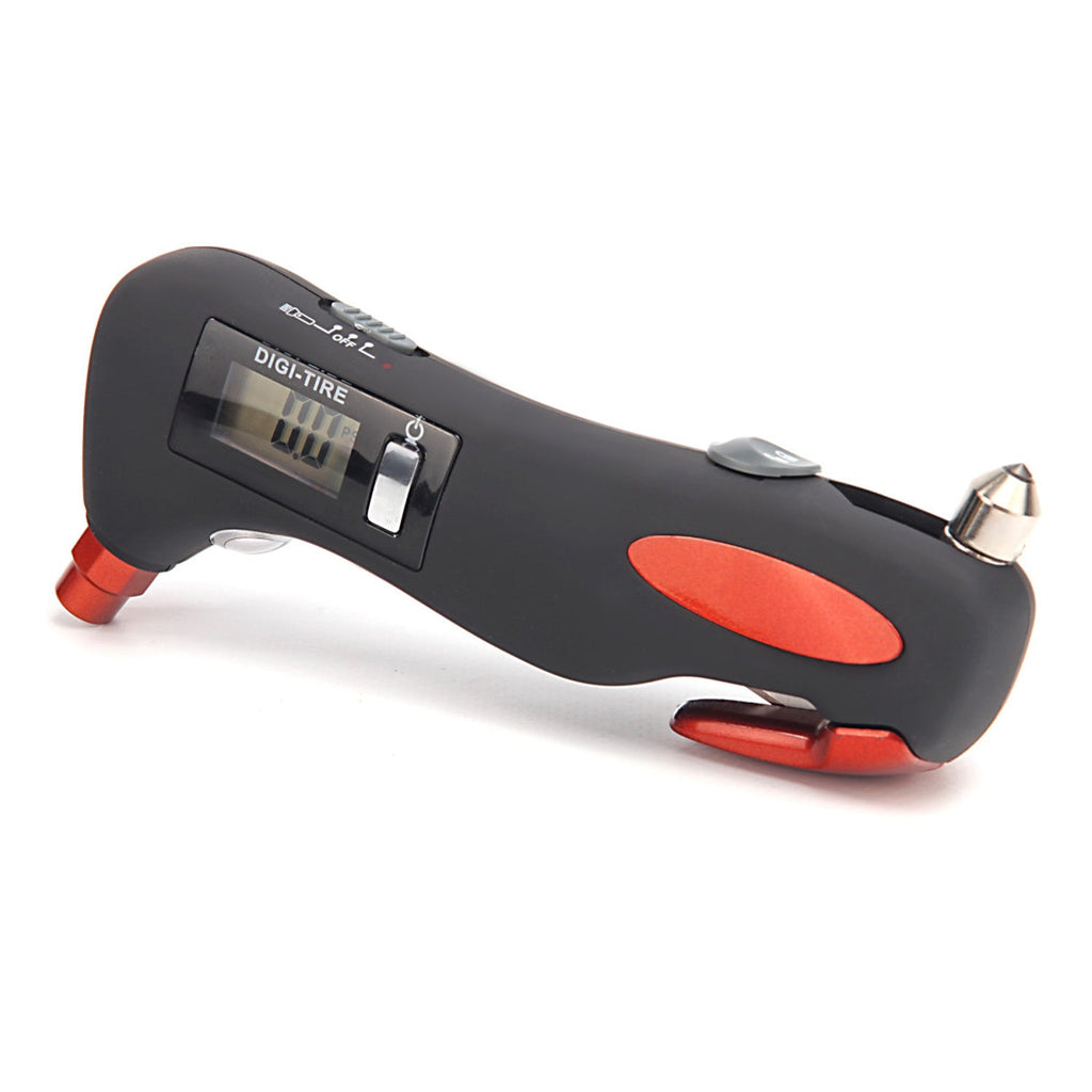 TOTO DIGITÁLNE ZARIADENIE NA MERANIE TLAKU PNEUMATÍK 4 V 1 má funkcie: digitálny manometer tlaku v pneumatikách, LED lampu, bezpečnostné kladivo a rezač bezpečnostného pásu.
