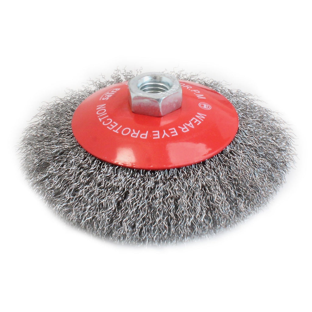 KUŽEĽOVÁ DRÔTENÁ KEFA PRE UHLOVÚ BRÚSKU 100MM SATRA je určená na efektívne odstraňovanie hrdze, farby, okují alebo iných zvyškov z kovových a oceľových povrchov. Kužeľový tvar umožňuje ľahký prístup do rohov, spojov a iných ťažko dostupných miest, čo ju robí ideálnou na prípravné a údržbové práce na povrchoch. Priemer kefy je 100 mm.