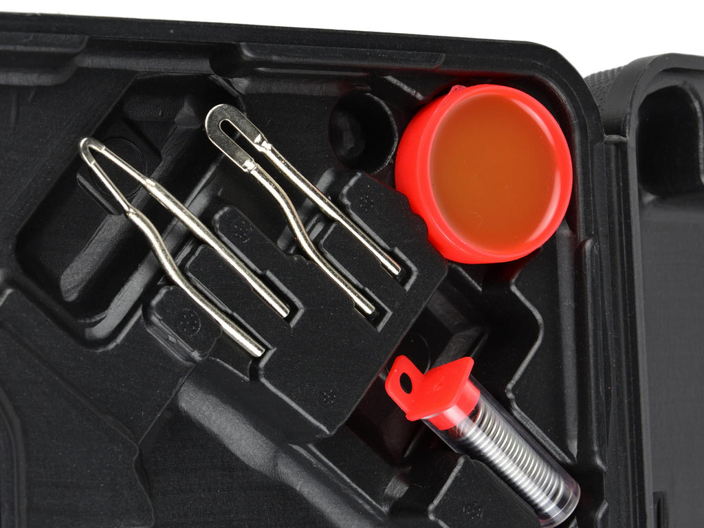 Presné výsledky sa dosahujú vďaka LED osvetleniu miesta spájkovania. Spájkovacia pištoľ sa napája z elektrickej siete. Má napätie 230-240 V / 50 Hz a výkon 200 W. Hrot pištole sa nahrieva okamžite. V sade je zahrnutá aj cievka s cínom a špeciálna pasta.
