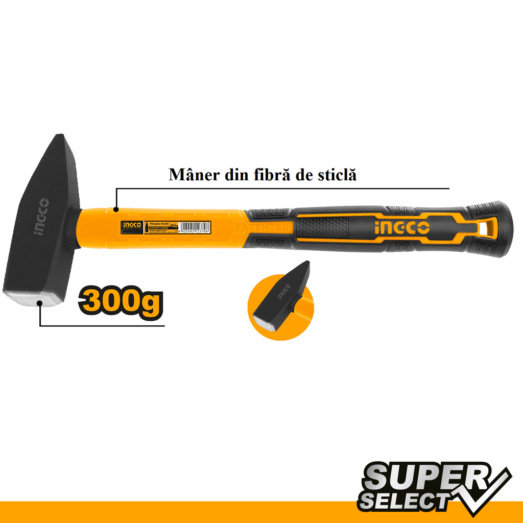 Kladivo s rukoväťou zo sklolaminátu 300g Ingco