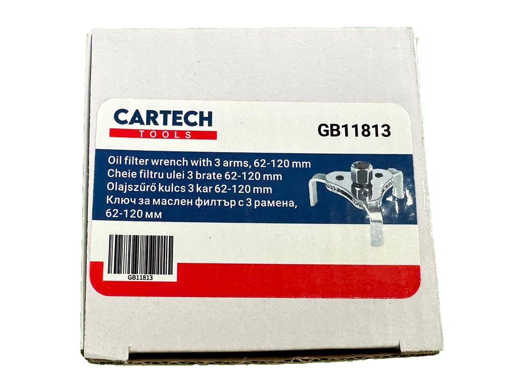 Tento KĽÚČ NA OLEJOVÝ FILTER 3 RAMENÁ 62–120 MM GEBO TOOLS je určený na odskrutkovanie olejových filtrov z kovového puzdra v motocykloch, osobných autách a dodávkach. Je vyrobený z Cr-V ocele (chróm-vanádium) s tvrdosťou 40–50 HRC.