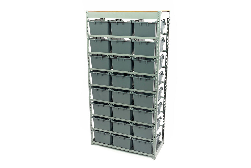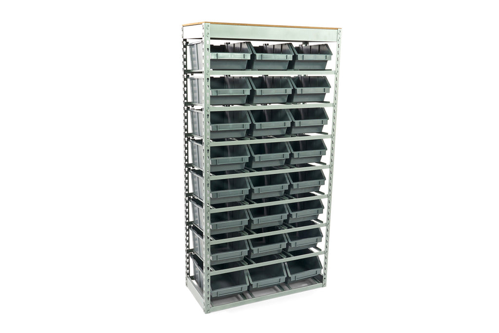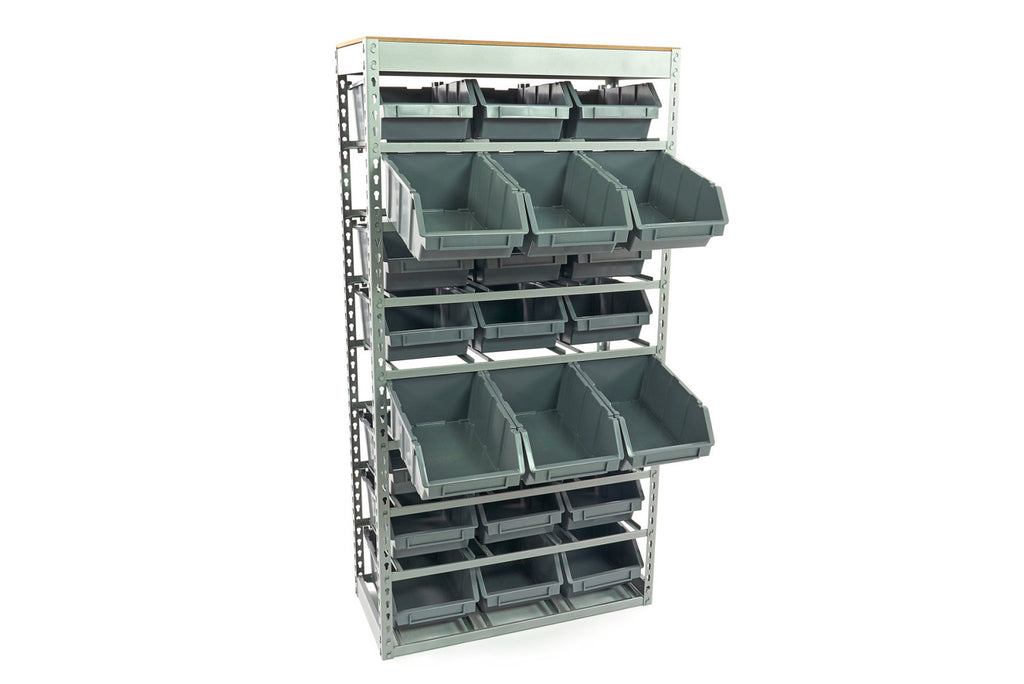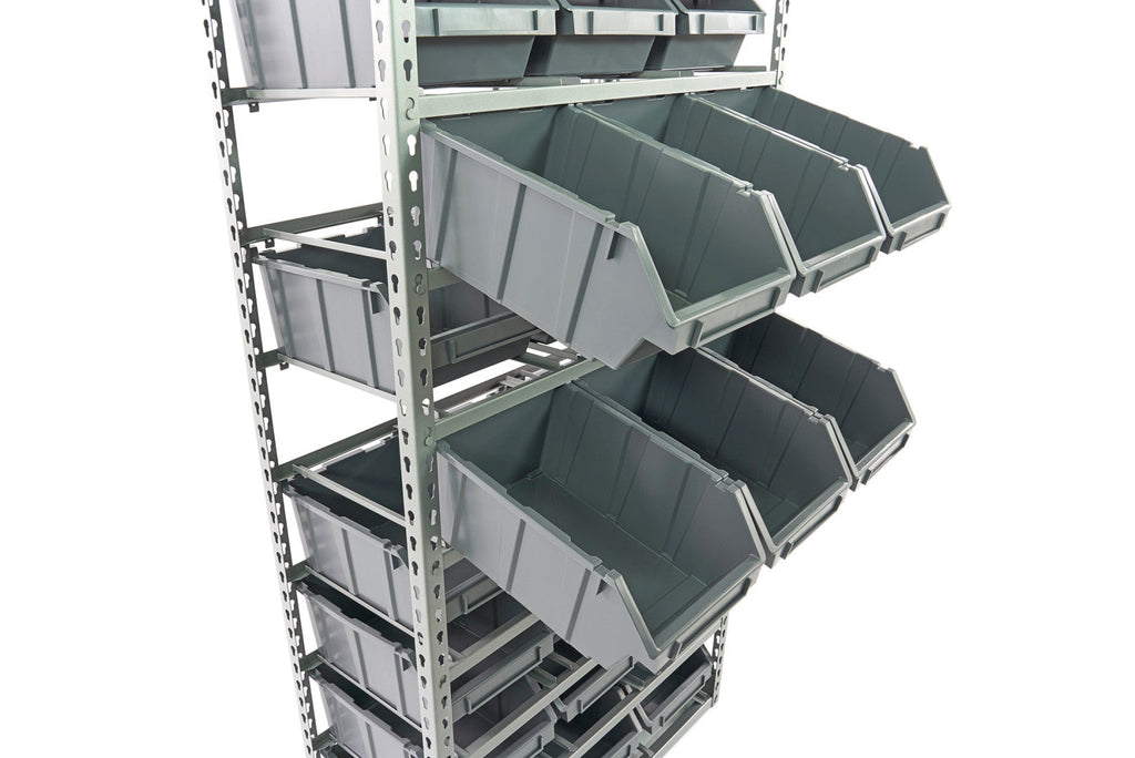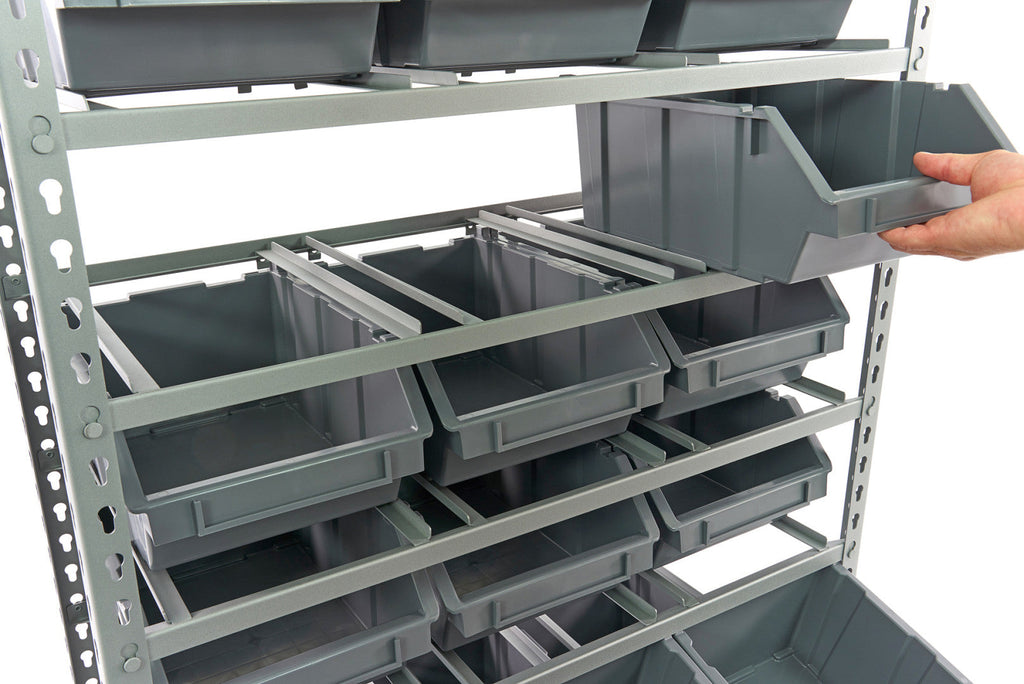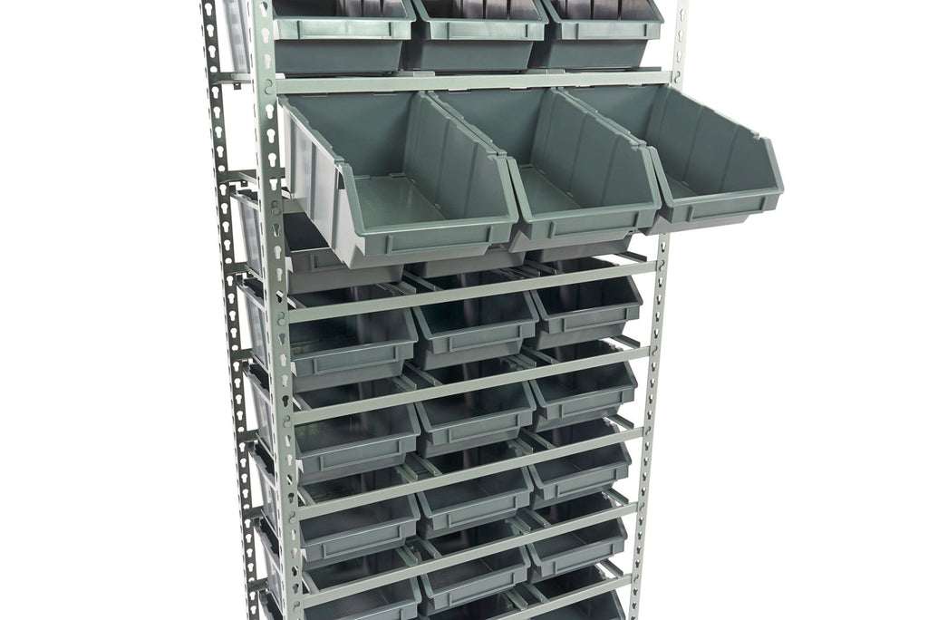 TENTO KOVOVÝ REGÁL S 24 ÚLOŽNÝMI BOXMI má široké otváranie v prednej časti každej nádoby, čo zaisťuje jednoduchý prístup k obsahu. Úložné boxy sú vyrobené zo 100 % polypropylénu, ktorý je odolný voči slabým kyselinám, hrdzi a korózii. Rám stojana je vyrobený z kovu a má práškový povlak odolný proti opotrebeniu a poškriabaniu.