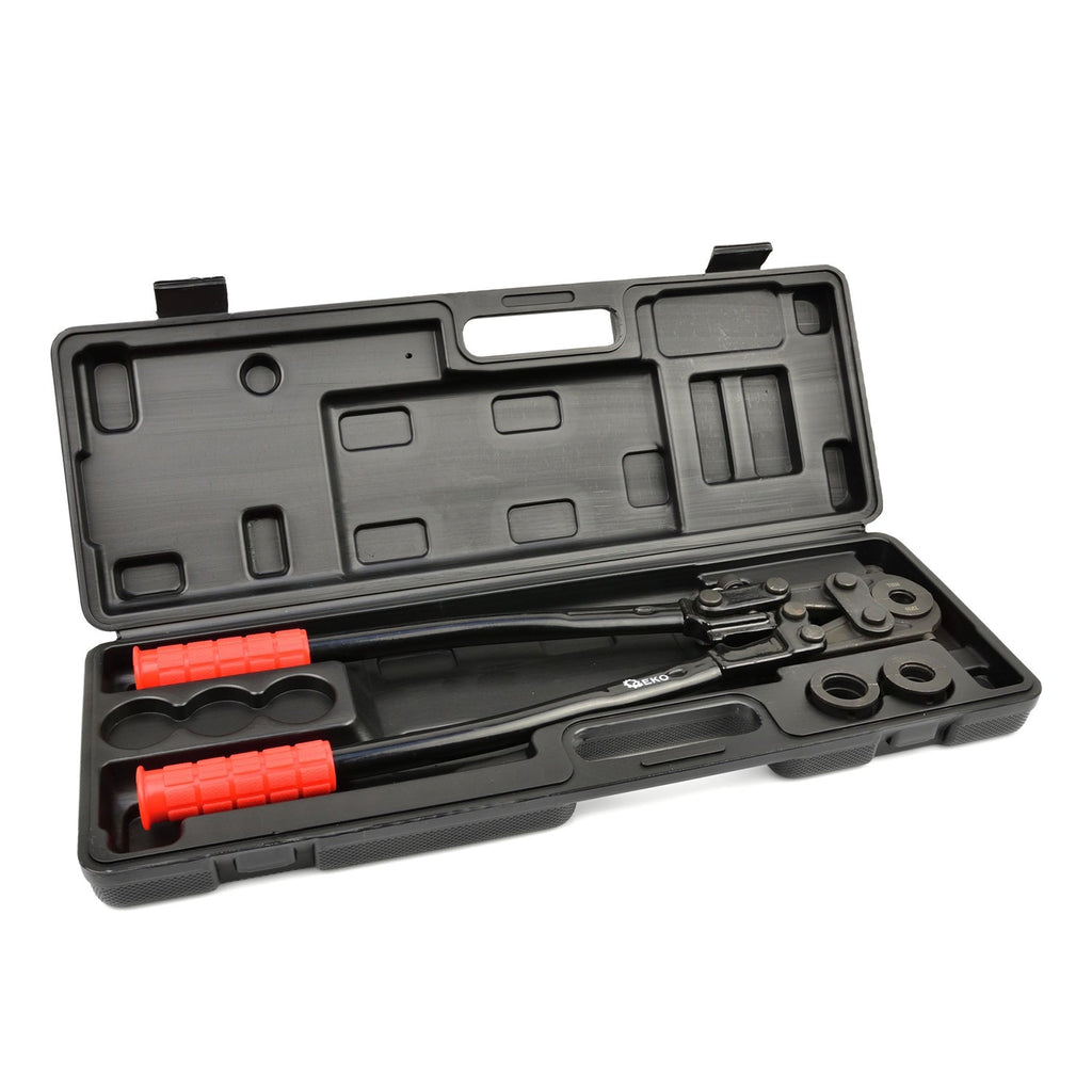 Tieto KRIMPOVACIE - LISOVACIE KLIEŠTE NA RÚRY GEKO sú profesionálny nástroj určený na bezpečné a efektívne spájanie rúr typu PEX, hliník-plast (PEX-AL-PEX), PB, hliníkových a medených rúr s fitingami a medenými spojkami. Zariadenie je vybavené výmennými čeľusťami typu TH (16, 20, 26 mm) a ponúka nastaviteľnú silu, prispôsobiteľnú rôznym druhom rúr a použitiu.