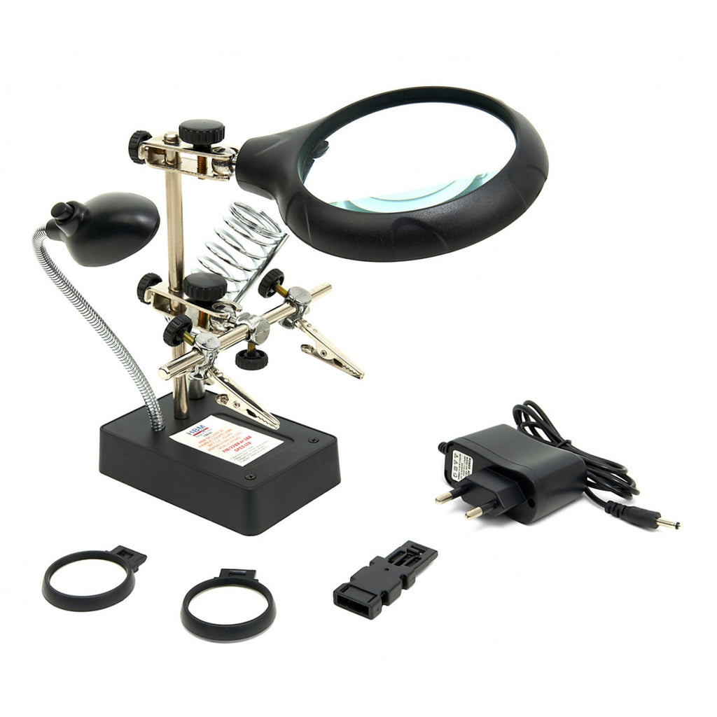 TÁTO LED PRACOVNÁ LAMPA S LUPU A KOVOVÝMI POMOCNÝMI RUKOVÄŤAMI NA SPÁJKOVANIE je multifunkčné zariadenie určené pre domácich majstrov. Môže byť používaná na spájkovanie a opravy hodinármi, klenotníkmi a technikmi. Prvky je možné nastaviť podľa potreby. Vďaka dobrej svietivosti a lupe budú objekty jasné a ľahko spracovateľné.