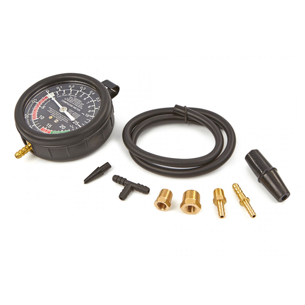 TENTO MANOMETER TLAKU A VÁKUOVÝ HBM je kompatibilný s väčšinou vozidiel. Súprava obsahuje 9 dielov a používa sa na diagnostiku porúch motora meraním tlaku čerpadla, systému a účinnosti regulátora tlaku.