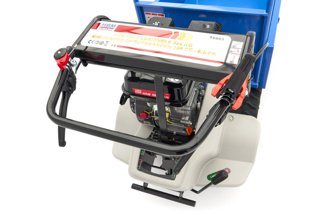 TENTO MINI DUMPER SKLÁPAČKA 320 KG HBM NA PÁSOVOM PODVOZKU S BENZÍNOVÝM MOTOROM 196 CMC 6.5HP podporuje nakladanie a prepravu všetkých druhov materiálov. Ideálny na prepravu materiálov do 320 kilogramov. Pneumatiky plnené vzduchom s pohonom všetkých kolies pre maximálnu oporu. Veľmi dobrá flexibilita a veľmi jednoduché používanie. Veľká nádoba, ideálna ako pre pevné, tak aj pre sypké materiály. Rukoväť je riaditeľná.