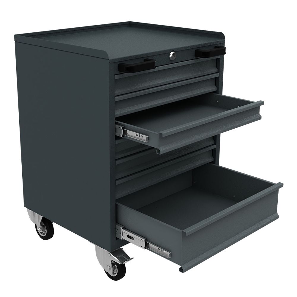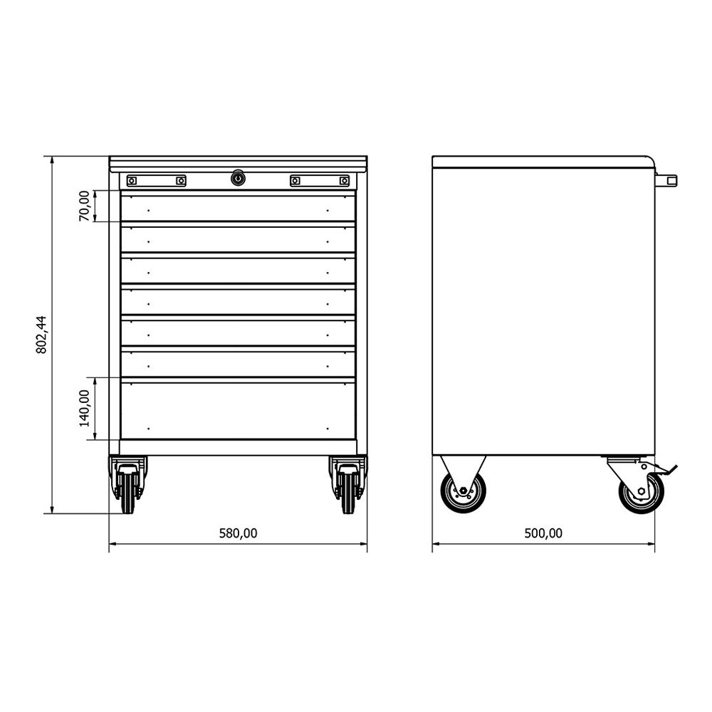 TÁTO SKRIŇA NA KOLIESKACH SO 7 ZÁSUVKAMI PRE DIELŇU 58 X 50 X 80 CM je vybavená siedmimi pevnými zásuvkami, ktoré sa úplne vysúvajú a sú vybavené guľkovými ložiskami. Všetky zásuvky je možné uzamknúť centrálne pomocou cylindrického zámku.