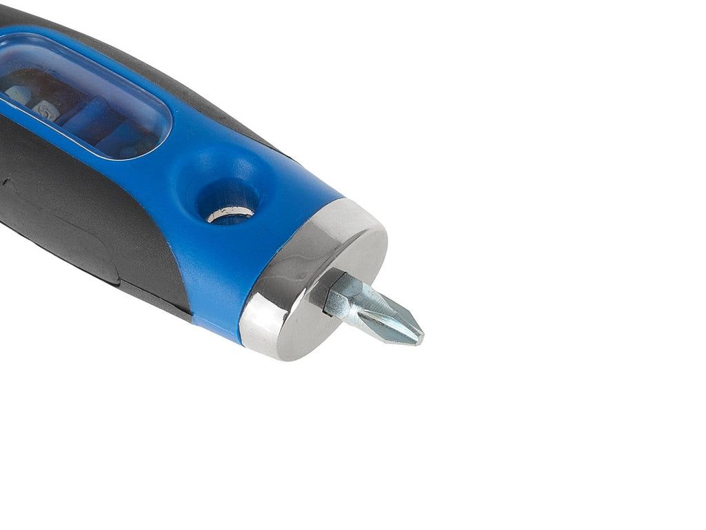 Integrovaný priestor na súpravu štyroch bitov 1/4" v rukoväti je ďalšou výhodou tohto nástroja. Rukoväť je tiež vybavená držiakom na bity, ktorý poskytuje doplnkovú funkciu praktického skrutkovača na rýchle uťahovanie alebo povoľovanie skrutiek.