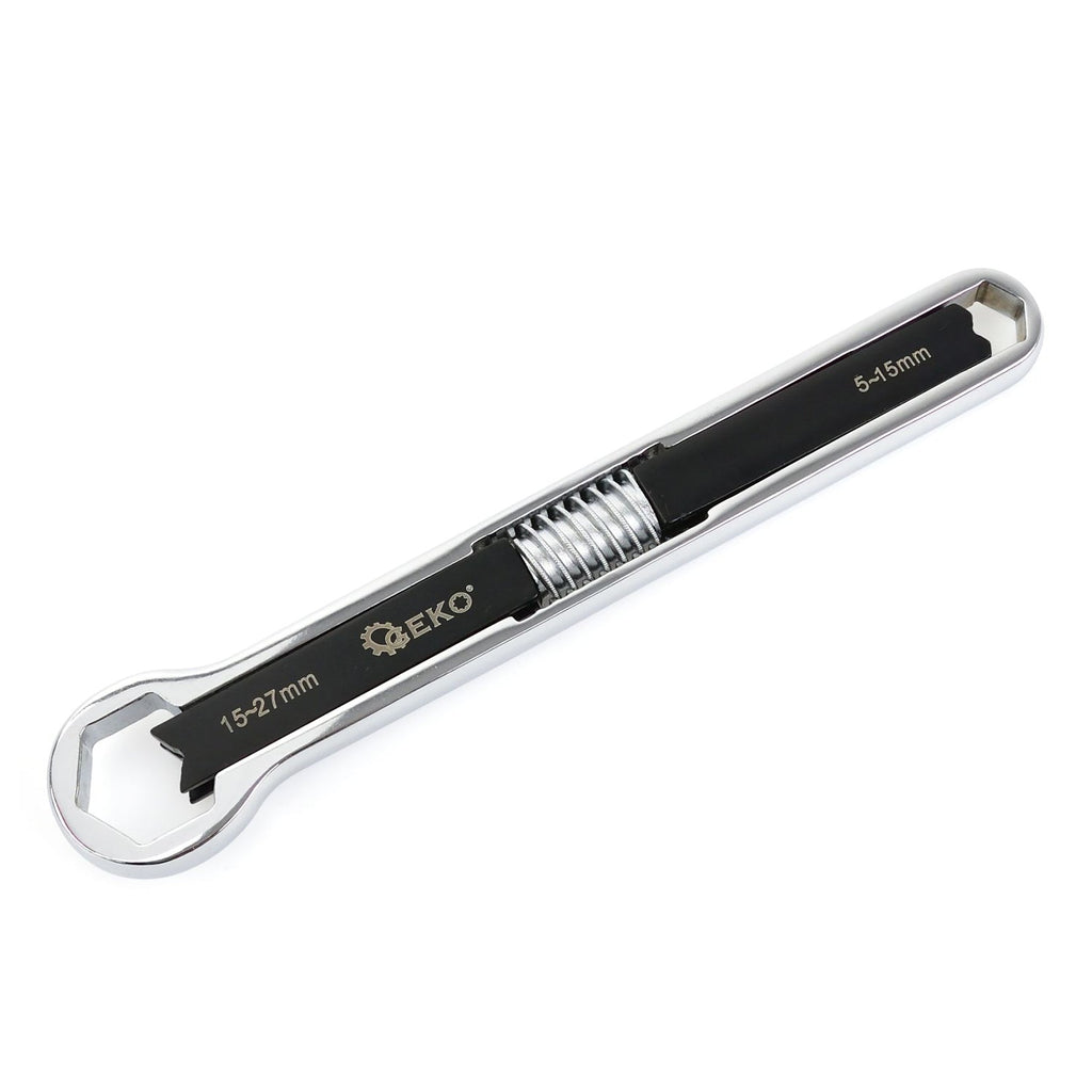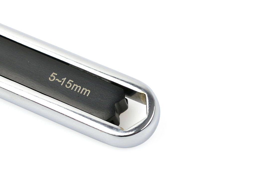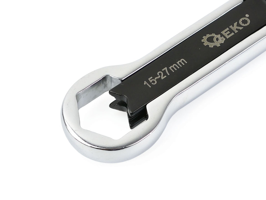 Táto DVOJITÁ NASTAVITEĽNÁ OČKOVÁ KĽÚČ 5-15MM / 15-27MM GEKO je vyrobená z odolnej Cr-V ocele. Zabudovaná skrutka umožňuje nastavenie od 5-15 mm do 15-27 mm.