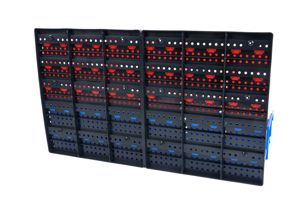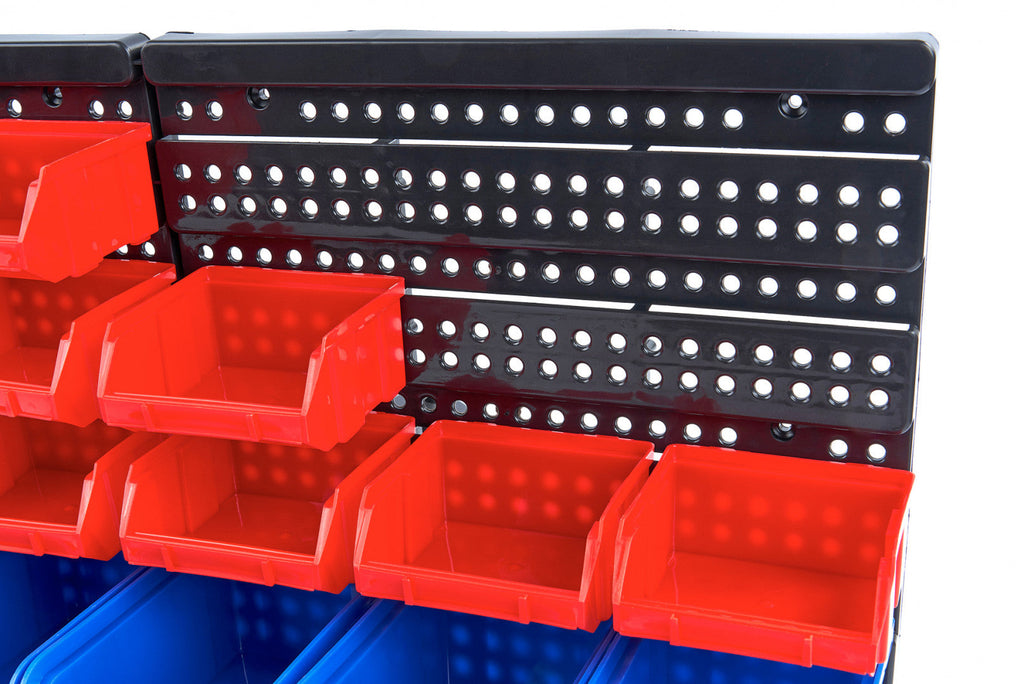 TENTO ORGANIZAČNÝ PANEL S 30 ÚLOŽNÝMI BOXAMI obsahuje 18 malých červených úložných boxov a 12 veľkých modrých úložných boxov. Nosnosť: 1,0 kg pre každý červený box a 1,5 kg pre každý modrý box.