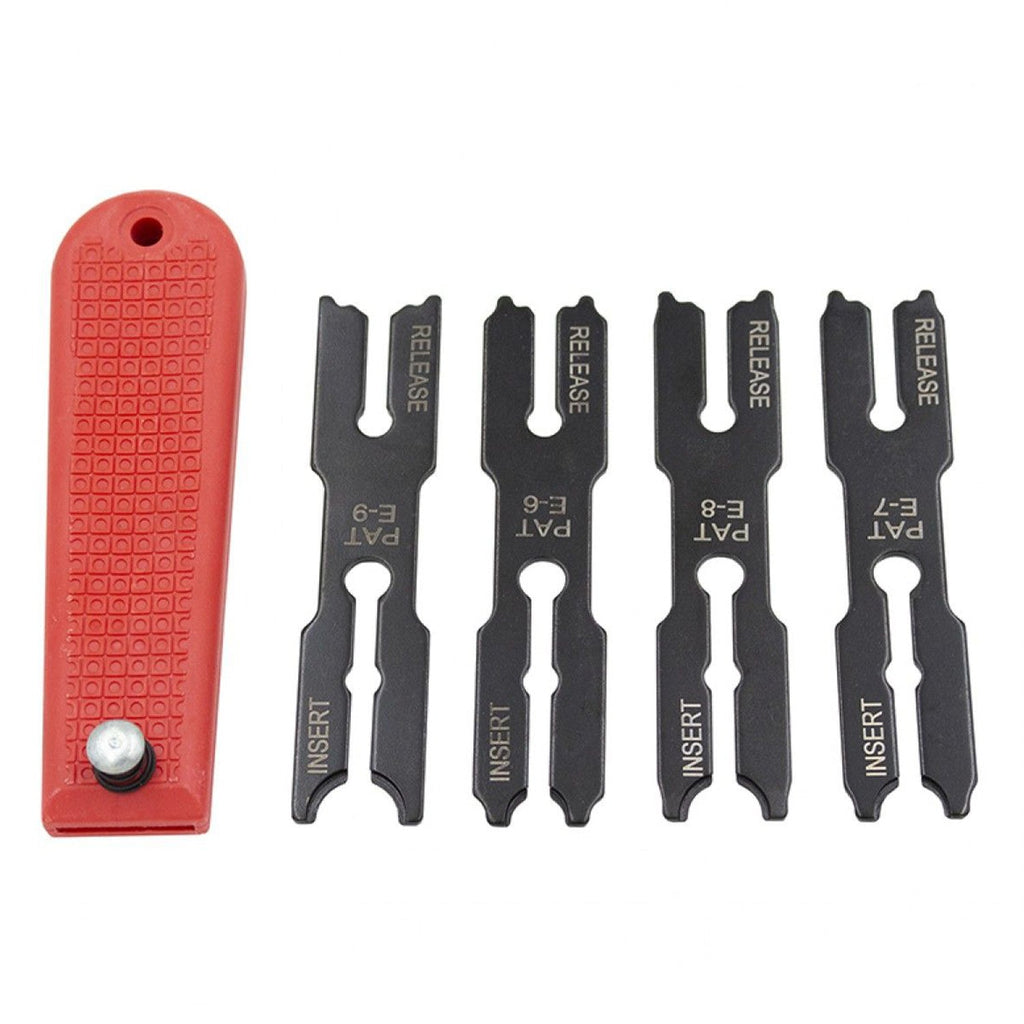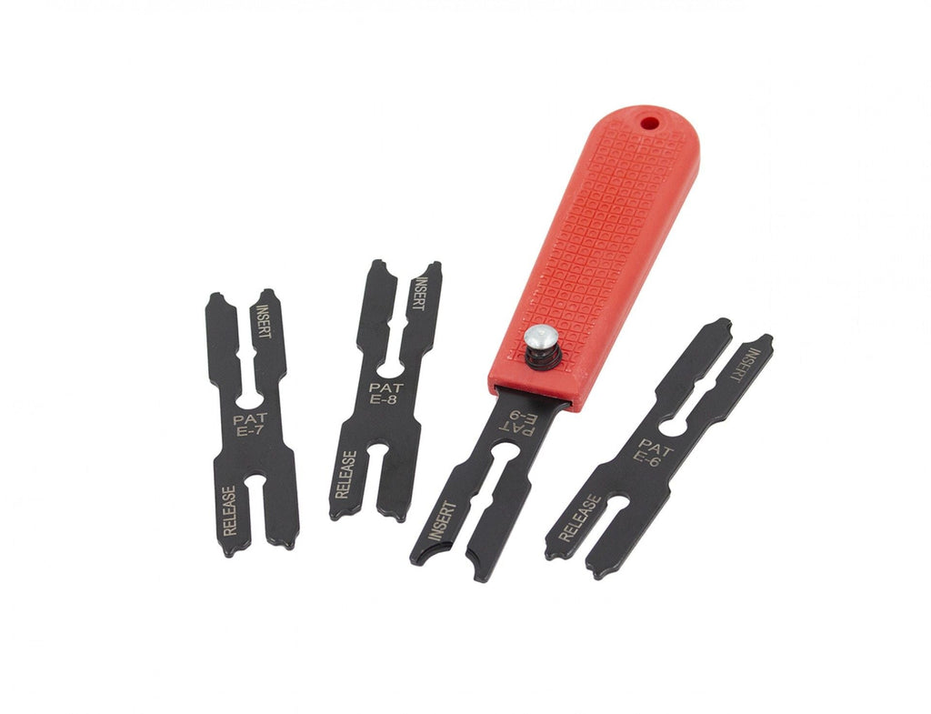 Toto zariadenie na montáž/demontáž poistných svoriek typu E má rukoväť so 4 čepeľami rôznych veľkostí od 6 do 9 mm. Jedným koncom môžete svorky montovať (INSERT) a druhým koncom ich môžete odstrániť (RELEASE) bez poškodenia.