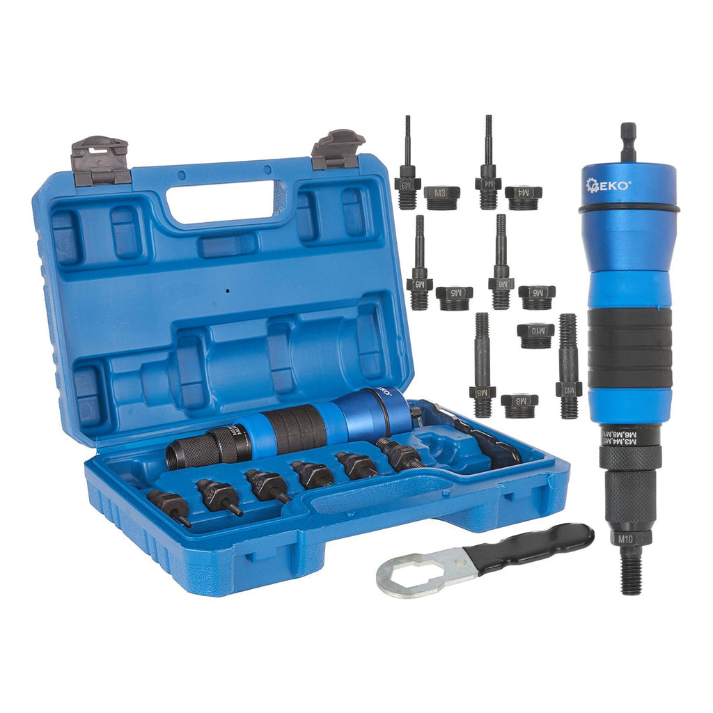 Súprava obsahuje nitovacie matice rôznych veľkostí, čo umožňuje prispôsobenie rôznym montážnym situáciám. Montážny kľúč zabezpečuje jednoduché a rýchle používanie, s presnou fixáciou matíc. Protišmyková rukoväť zaručuje komfort aj pri dlhodobom používaní.