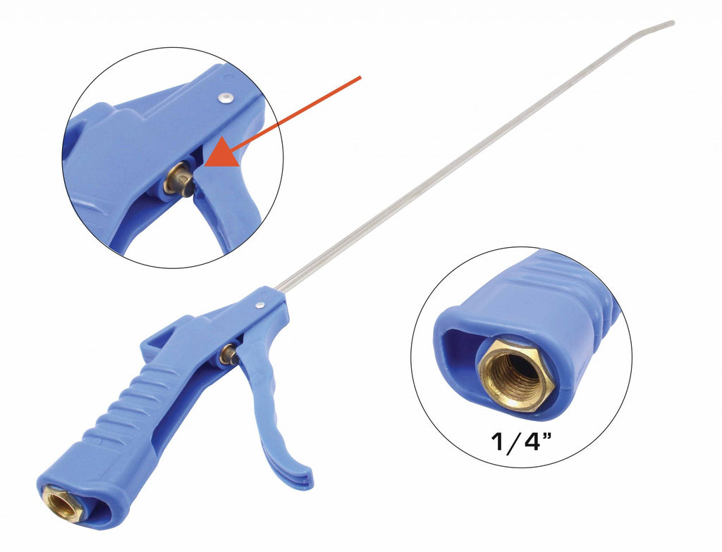 PISTOĽ NA FÚKANIE VZDUCHU S EXTRA DLHOU ŠPIČKOU 508MM SATRA je účinný nástroj na používanie stlačeného vzduchu pri čistiacich operáciách. Vďaka predĺženej dĺžke špičky umožňuje ľahký prístup do ťažko dostupných miest, je ideálny na odstraňovanie prachu a iných nečistôt zo zariadení alebo rôznych povrchov. Dĺžka je 508 mm.