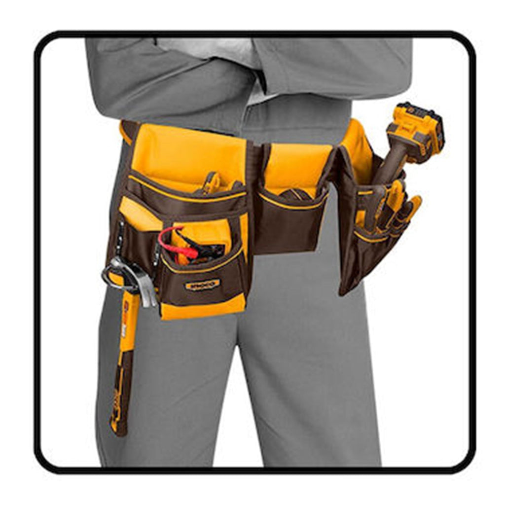 OPASOK NA NÁRADIE A NÁSTROJE INGCO je vyrobený z polyesteru 1680D. Má tri hlavné priehradky – dve s rozmermi 26 x 23 cm a jednu menšiu s rozmermi 17 x 14 cm. Okrem týchto priehradiek obsahuje ďalších 10 špeciálnych úložných priestorov na náradie, vrátane priehradky na kladivo. Opasok má nastaviteľnú dĺžku v rozmedzí 92 – 127 cm. Maximálna nosnosť je 10 kg.