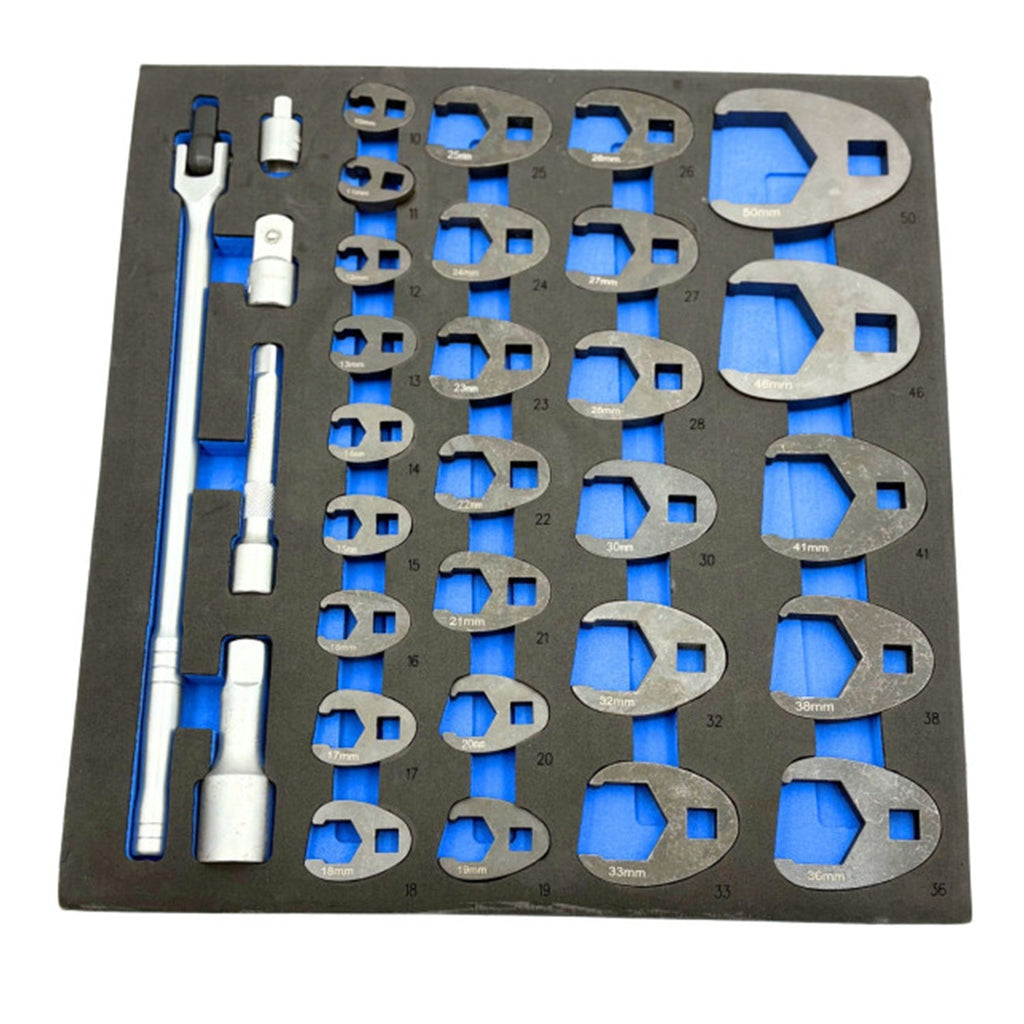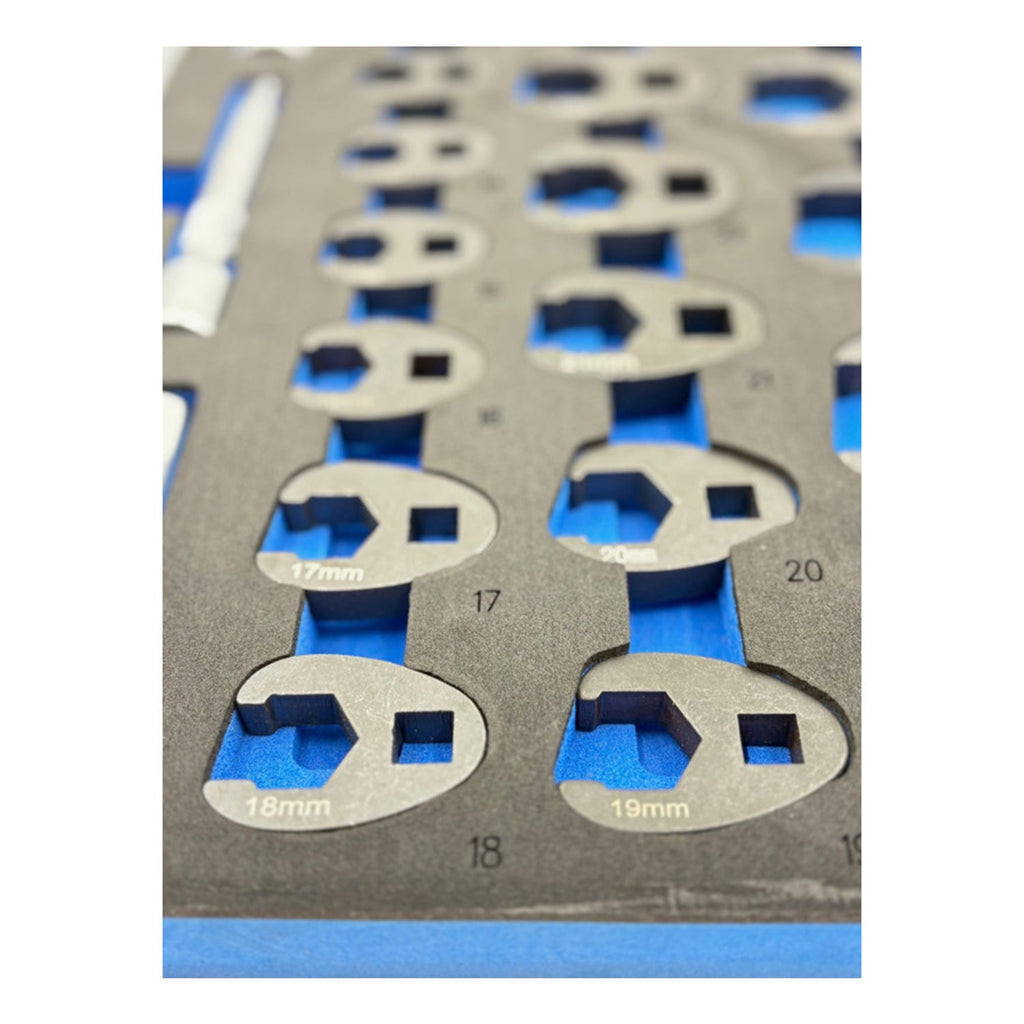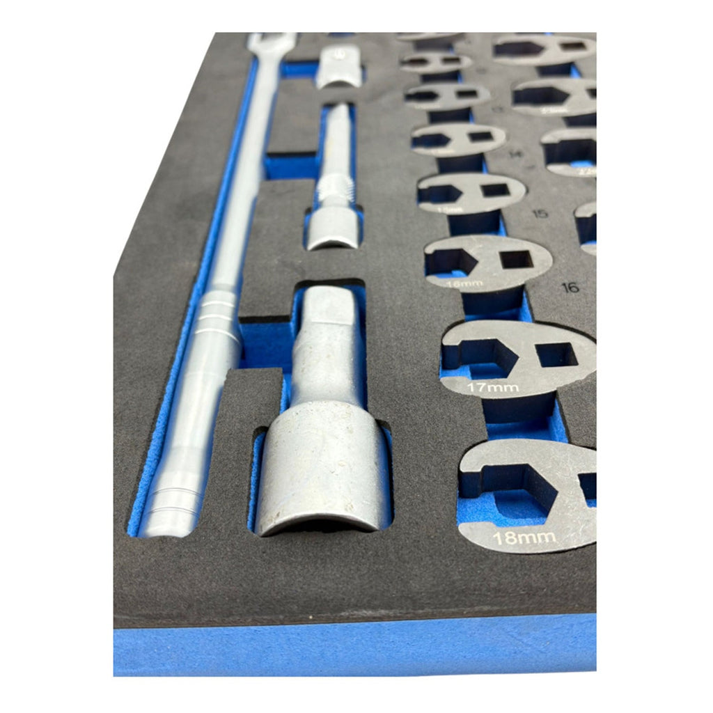 TENTO MODUL SADA POLOOTVORENÝCH KĽÚČOV NA BRZDOVÉ A PALIVOVÉ POTRUBIA S PÁKOU 32 KUSOV je určený na prácu s brzdovými a palivovými potrubiami, užitočný najmä v priestoroch s obmedzeným prístupom. Sada obsahuje 32 polootvorených kľúčov s hlavou v tvare havranej nohy, usporiadaných v penovom module, kompatibilných s pohonom 3/8”, 1/2” a 3/4”.