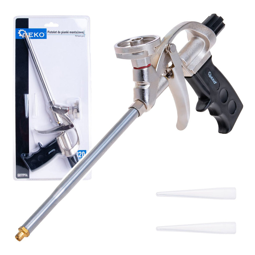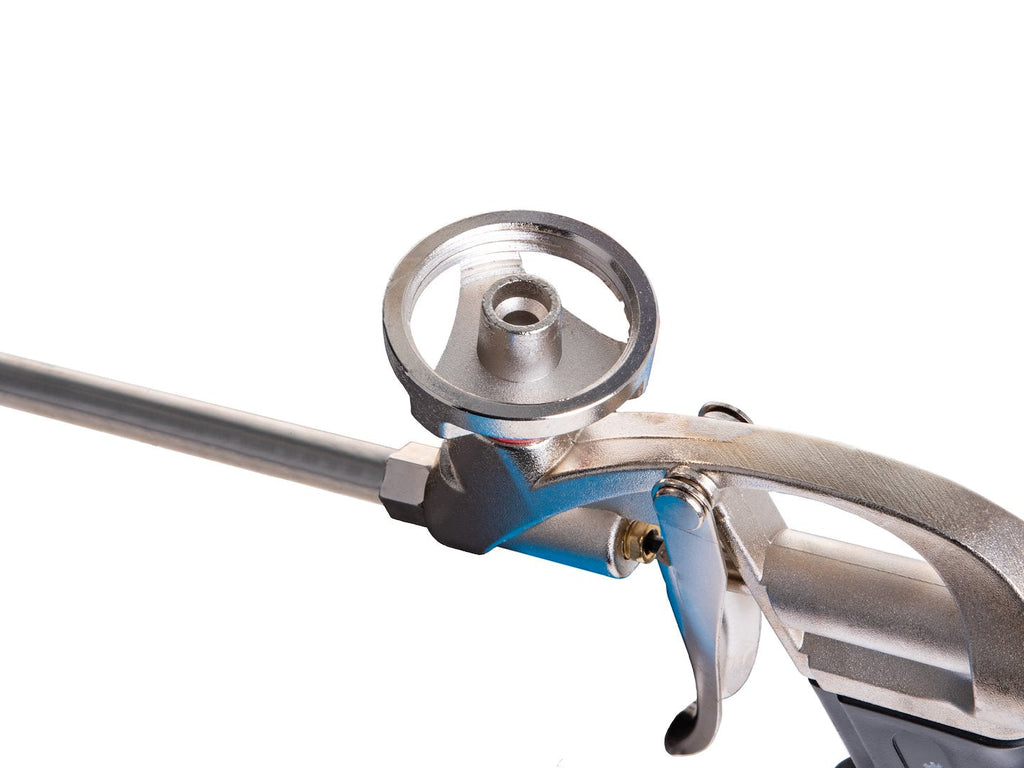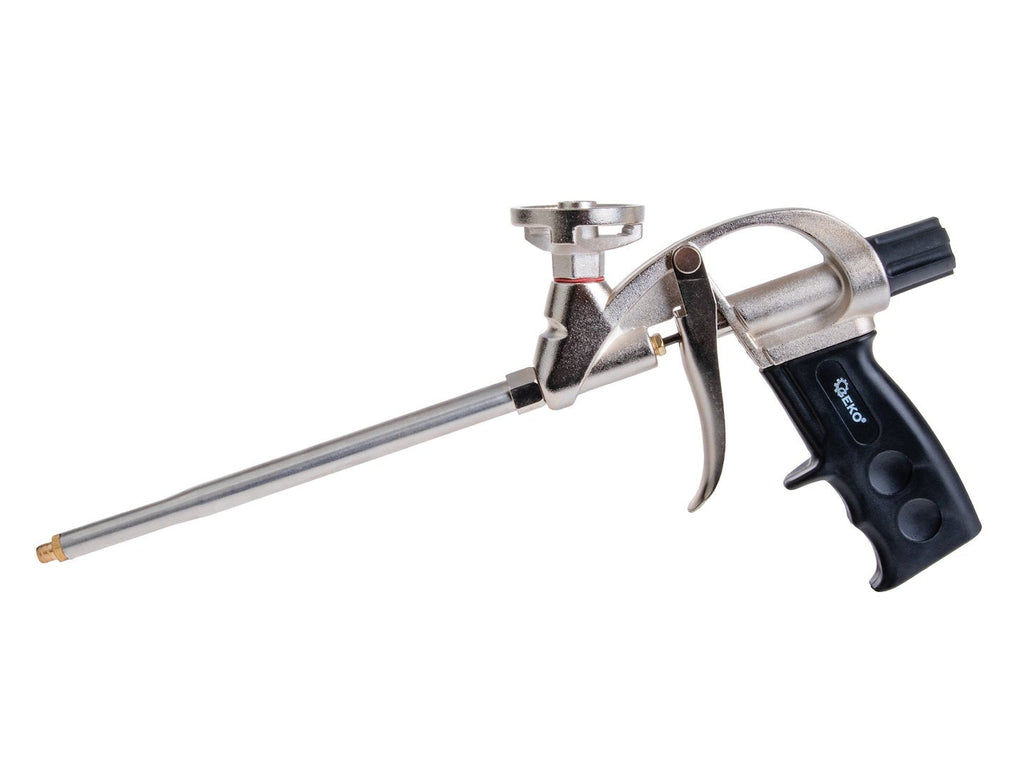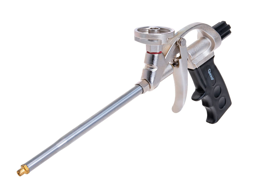TÁTO PIŠTOĽ NA NANÁŠANIE POLYURETÁNOVEJ PENE je vyrobená z mosadze, nehrdzavejúcej ocele, hliníka a plastu a je potiahnutá PTFE. Má dĺžku 32 cm a umožňuje nanášanie peny aj na ťažko dostupné miesta. Regulácia prietoku peny vám umožní nastaviť množstvo nanášaného materiálu. Ergonomická rukoväť poskytuje bezpečný a pohodlný úchop.