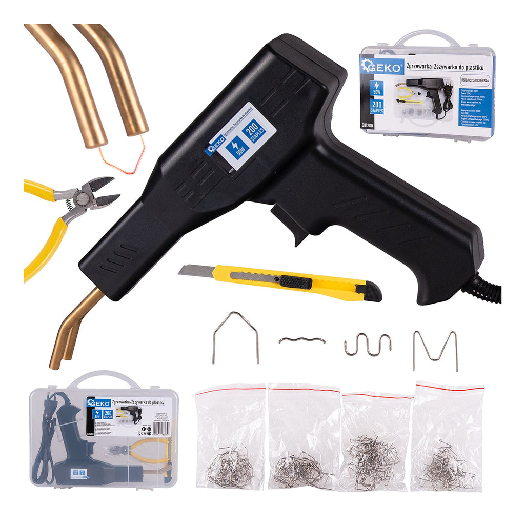 TÁTO LEPIACA A OPRAVNÁ PIŠŤOĽ NA PLAST 50W S 200 SPONKAMI je vhodná na zváranie plastových materiálov, odstraňovanie medzier a opravu dier bez použitia klincov, tepelného rezania, spájkovania olovom alebo tepelného vyhladzovania.