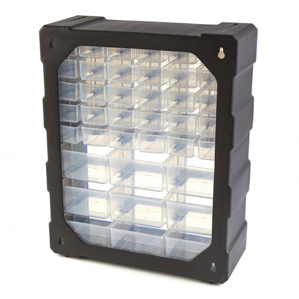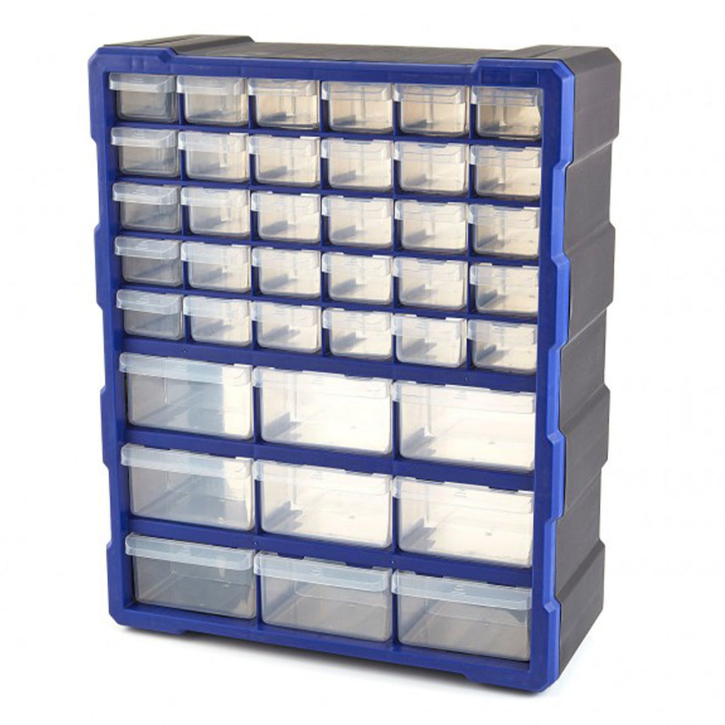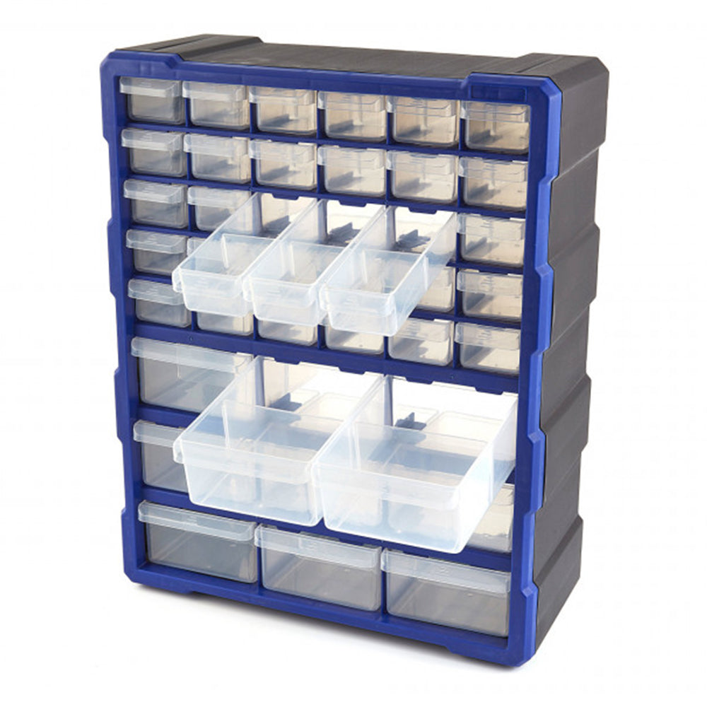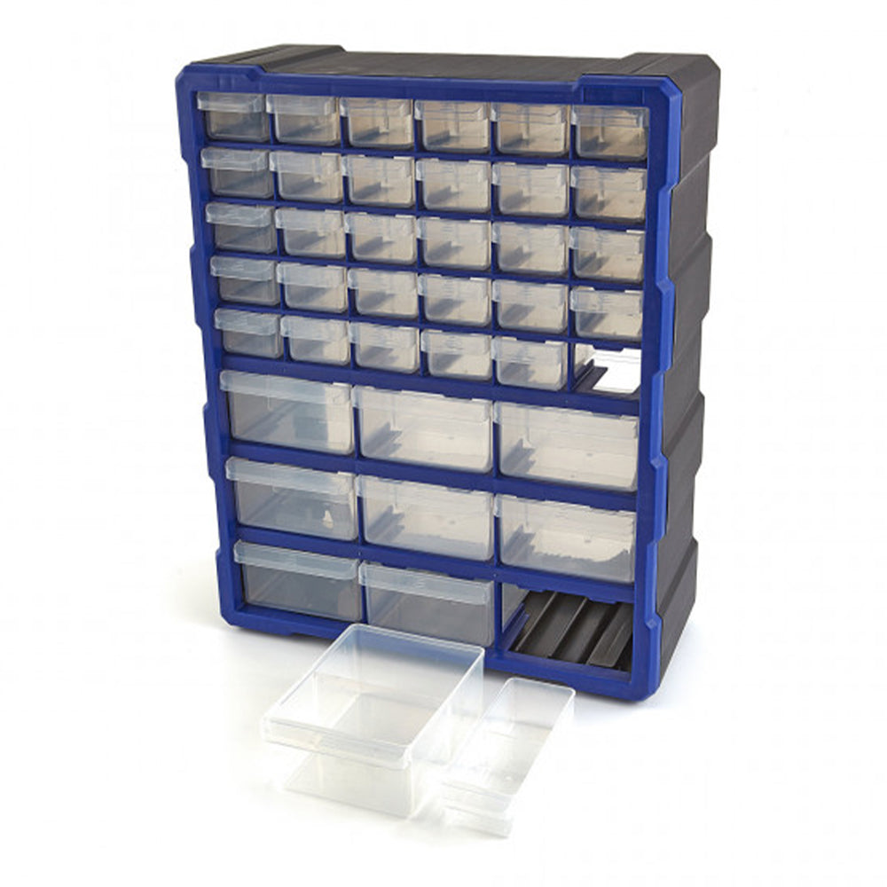 TÁTO PLASTOVÁ ORGANIZAČNÁ SKRINKA NA SKLADOVANIE S 39 ZÁSUVKAMI je ideálna na uskladnenie malých dielov, ako sú skrutky, matice a iné upevňovacie prvky.