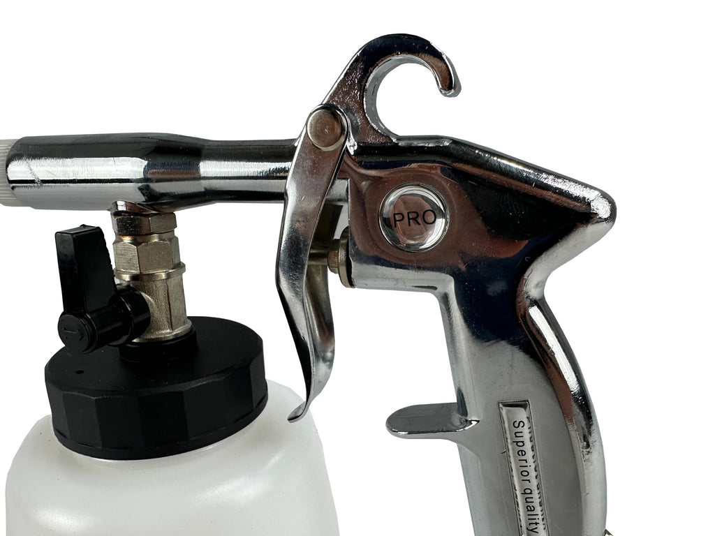PNEUMATICKÁ PIŠTOĽ NA ČISTENIE ČALÚNENIA TORNADOR MODEL 1 GEBO TOOLS zaisťuje optimálne čistenie vďaka pracovnému tlaku 5–8 barov a efektu tornádového prúdenia vody a vzduchu. Nádrž má kapacitu 1 liter. Okrem toho je pištoľ vybavená regulátorom tlaku vzduchu pri prípojke.