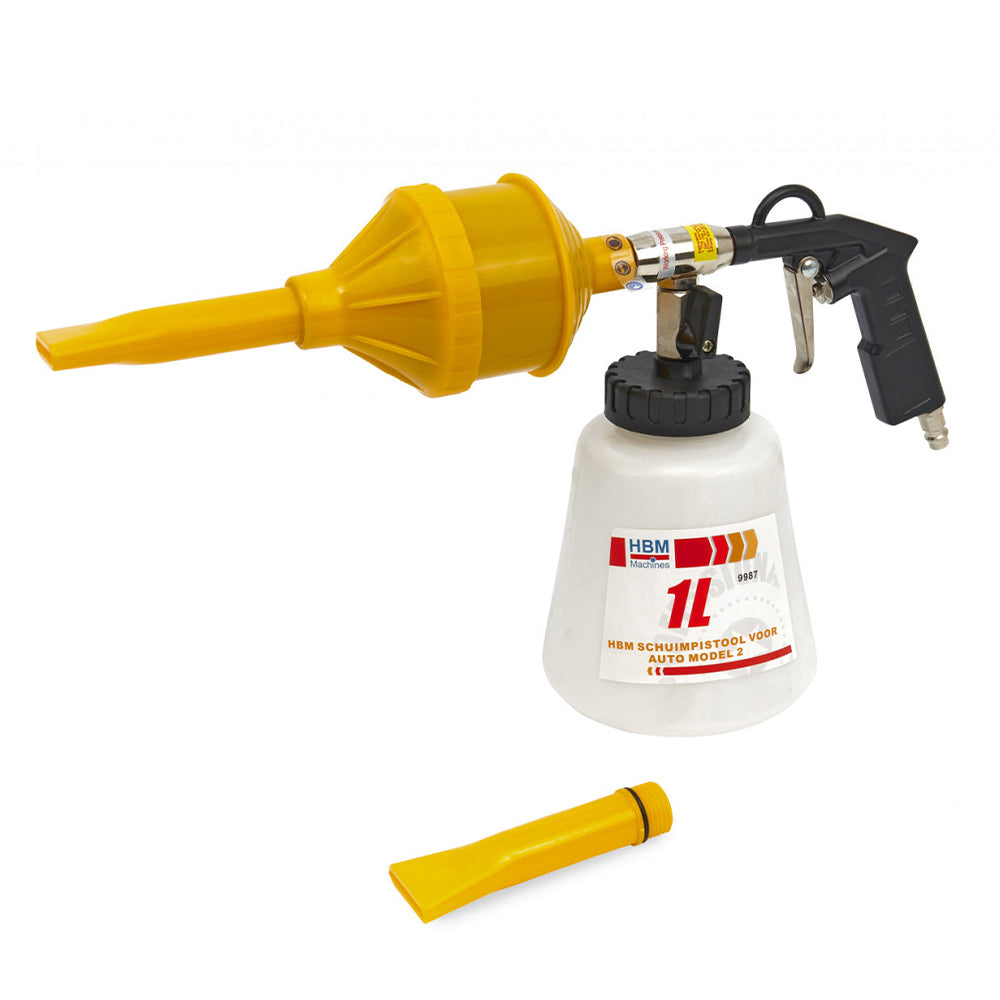 TÁTO PNEUMATICKÁ PIŠTOĽ TORNADOR SUCHÁ PENA HBM sa pripája na stlačený vzduch a produkuje ultra suchú penu. Je určená na predumývanie, aby sa bezpečne odstránilo čo najviac nečistôt z auta, nákladného vozidla, karavanu a pod. pred samotným umývaním. Slúži iba ako metóda predumývania.