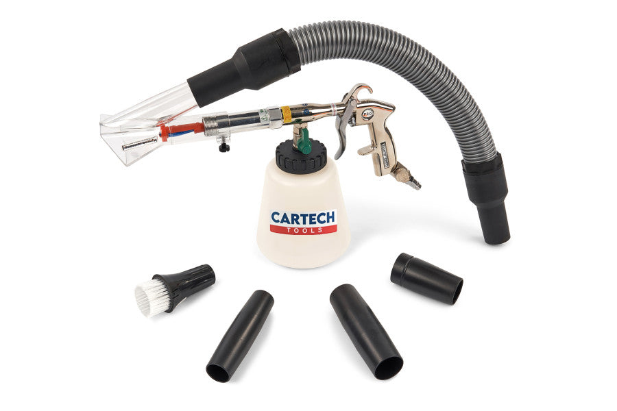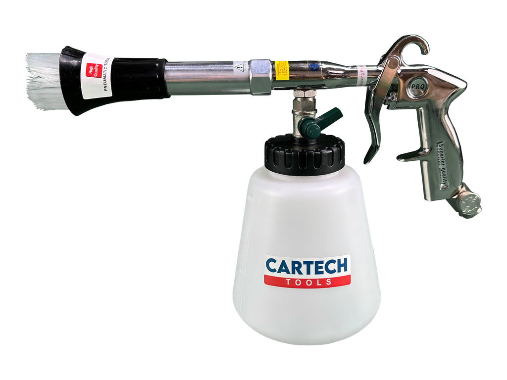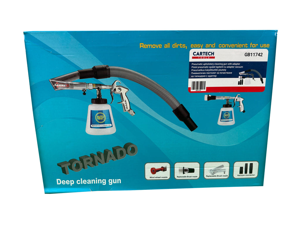 TÁTO PNEUMATICKÁ PIŠTOĽ NA ČISTENIE ČALÚNENIA TORNADOR S ADAPTÉROM NA VYSÁVANIE GEBO TOOLS je vybavená otočnou hadicou, cez ktorú je pod vysokým tlakom vypúšťaný vzduch a čistiaci prostriedok. Pištoľ je možné používať aj vo vertikálnej polohe.
