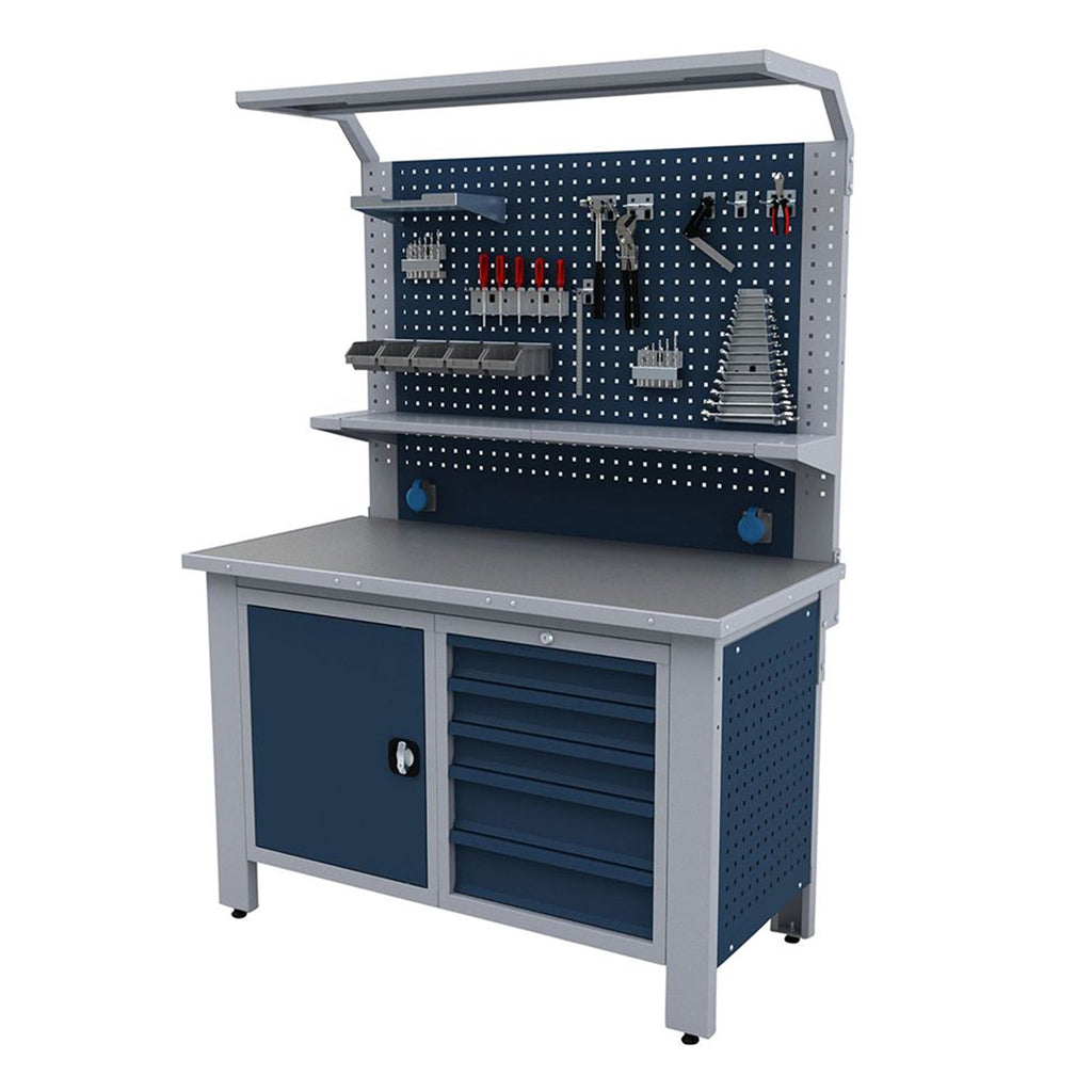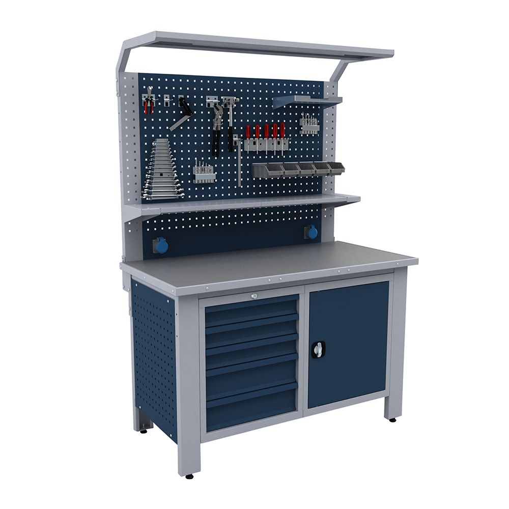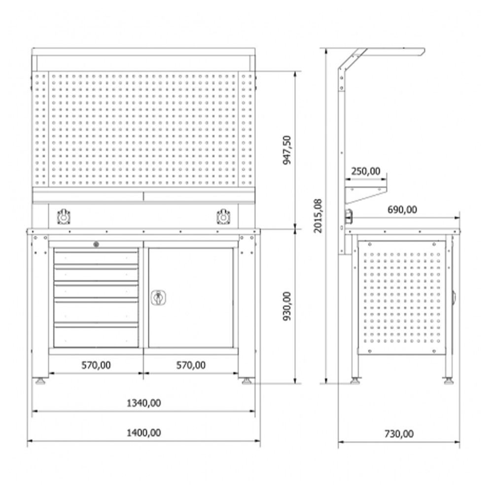 TENTO PRIEMYSELNÝ PRACOVNÝ STÔL - MODULÁRNY KOVOVÝ NÁBYTOK PRE DIELŇU 1.4M je určený na profesionálne použitie, najmä v dielňach. Umožňuje uskladnenie náradia prehľadným spôsobom. Zásuvky majú nosnosť až 100 kg. Pracovný stôl je tiež vybavený nastaviteľnými nohami, takže stojí pevne aj na nerovnej podlahe. Doska je vybavená PVC poťahom s protišmykovou vrstvou. Vybavený je pevným, energeticky úsporným LED osvetlením.