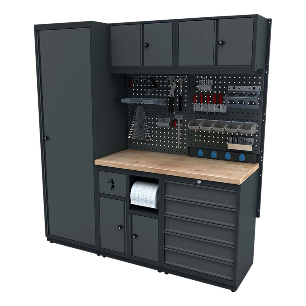 TENTO PRACOVNÝ STÔL - MODULÁRNY KOVOVÝ NÁBYTOK PRE DIELŇU 1.86M MODEL A je určený na profesionálne použitie, najmä v dielňach. Poskytuje dostatok priestoru na uskladnenie náradia. Okrem toho je stôl vybavený štyrmi zásuvkami 230V. Vybavený LED osvetlením, ktoré pomáha šetriť energiu.