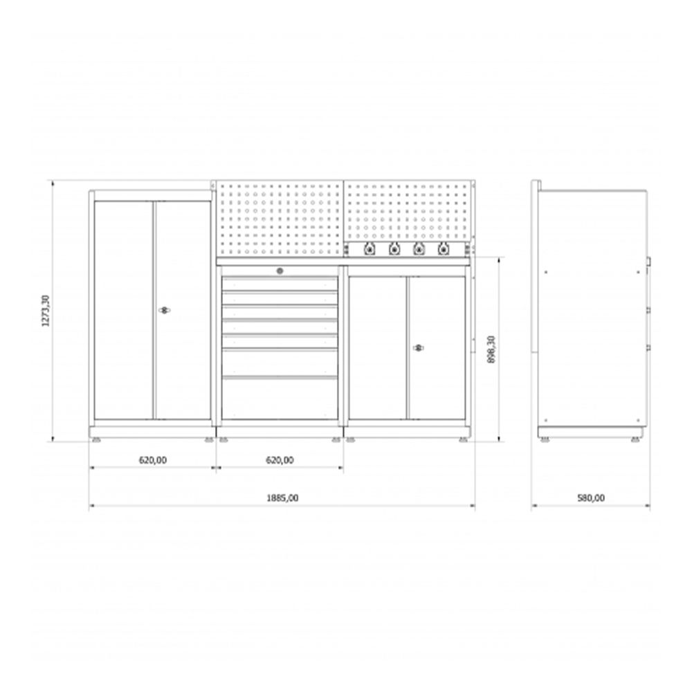 TENTO PRACOVNÝ STÔL - MODULÁRNY KOVOVÝ NÁBYTOK PRE DIELŇU 1.88M MODEL B je určený na profesionálne použitie, najmä v dielňach. Poskytuje dostatok priestoru na uskladnenie náradia. Okrem toho je stôl vybavený štyrmi zásuvkami 230V.