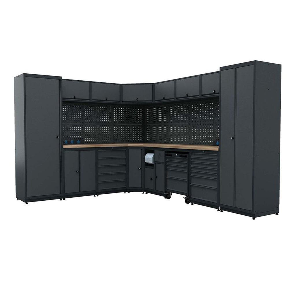 TENTO PRACOVNÝ STÔL - MODULÁRNY KOVOVÝ NÁBYTOK PRE DIELŇU 3.23 M X 2.61 M MODEL 4 je určený na profesionálne použitie, najmä v dielňach. Poskytuje dostatok priestoru na uskladnenie náradia. Okrem toho je stôl vybavený ôsmimi zásuvkami 230V.