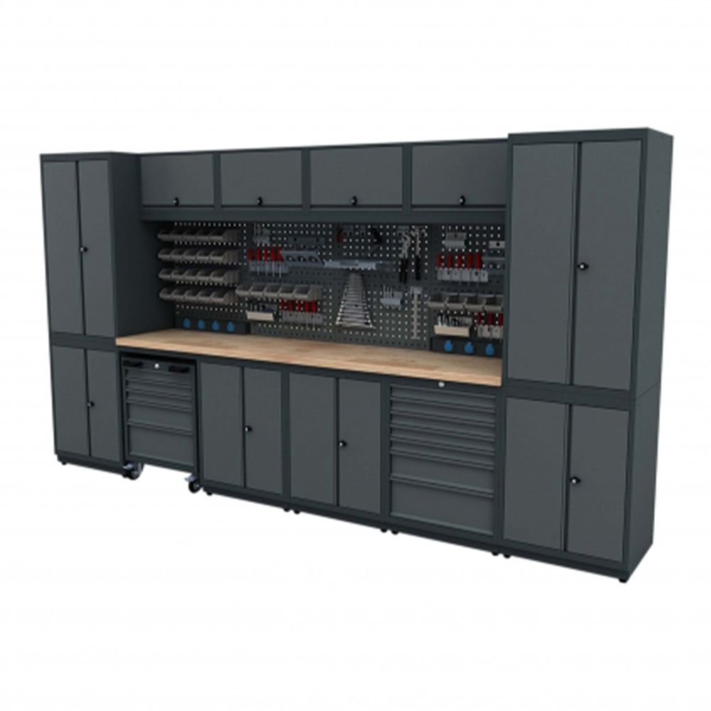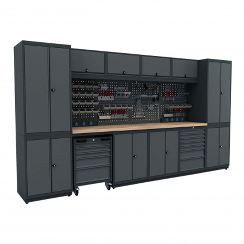 TENTO PRACOVNÝ STÔL - MODULÁRNA KOVOVÁ SÚPRAVA NÁBYTKU PRE DIELŇU 3.72M MODEL G je vhodný na vybavenie dielne, pretože má zásuvky na odkladanie a pracovnú dosku. Je vybavený 4 zásuvkami 230V a má dostatok úložného priestoru na náradie.