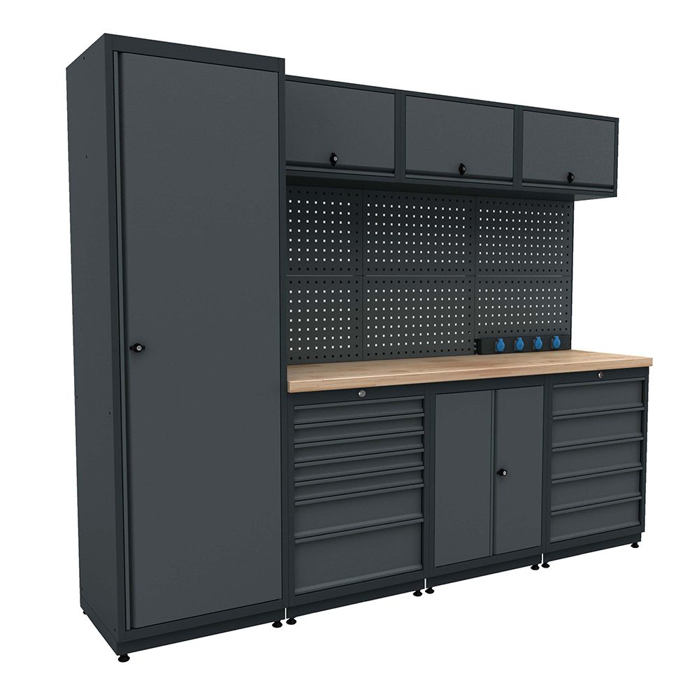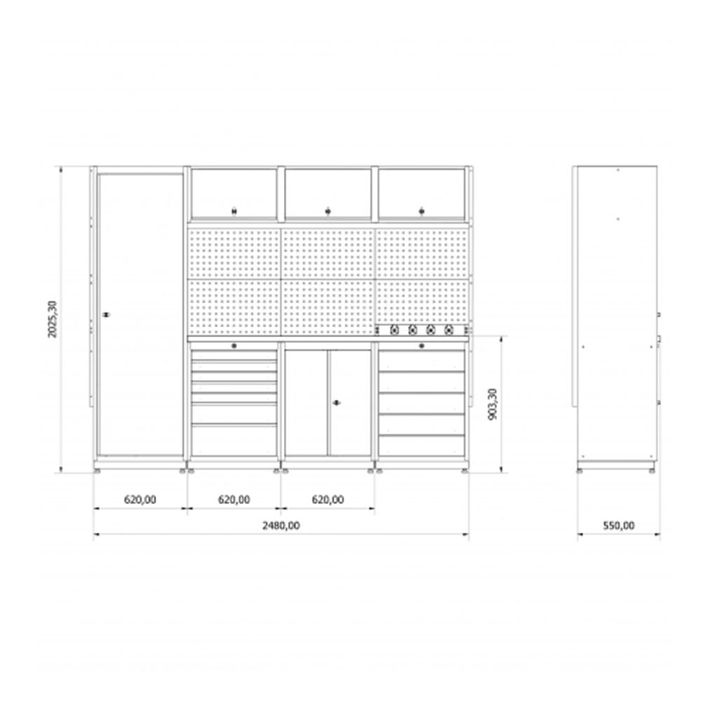 Modulárny kovový nábytok do dielne, zostava s pracovným stolom 2,48m model 3