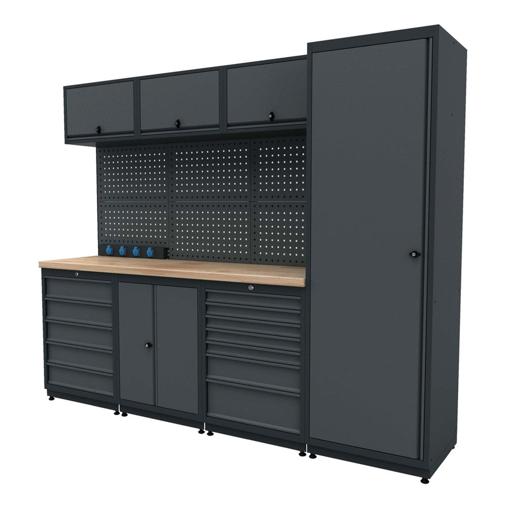 TENTO PRACOVNÝ STÔL - MODULÁRNY KOVOVÝ NÁBYTOK PRE DIELŇU 2.48M MODEL 3 je určený na profesionálne použitie, najmä v dielňach. Poskytuje dostatok priestoru na uskladnenie náradia. Okrem toho je stôl vybavený štyrmi zásuvkami 230V.
