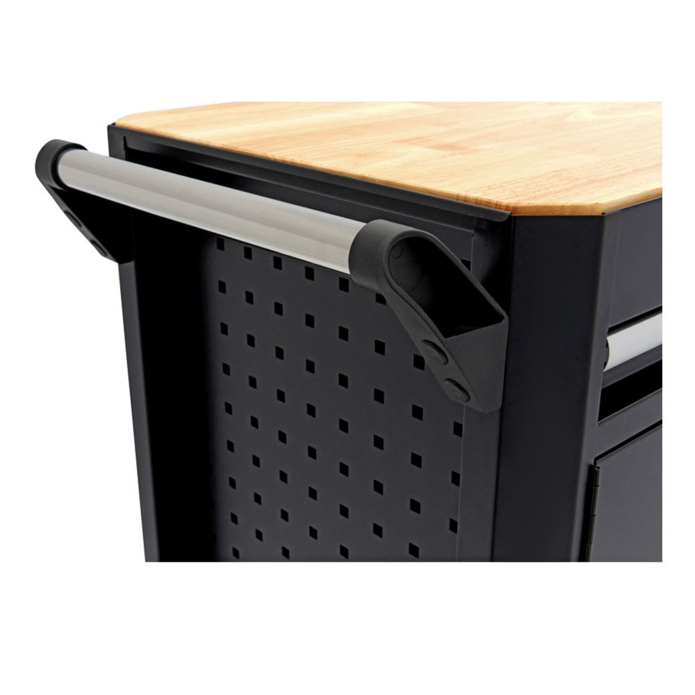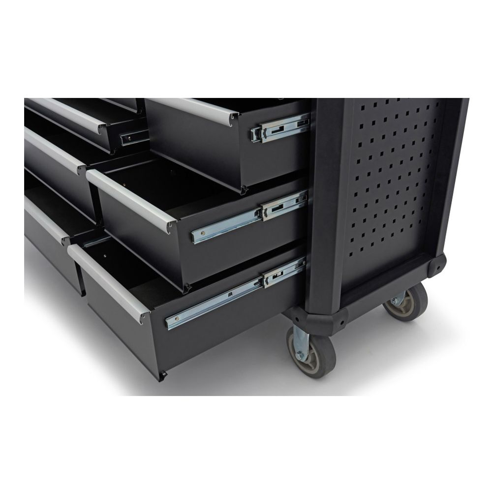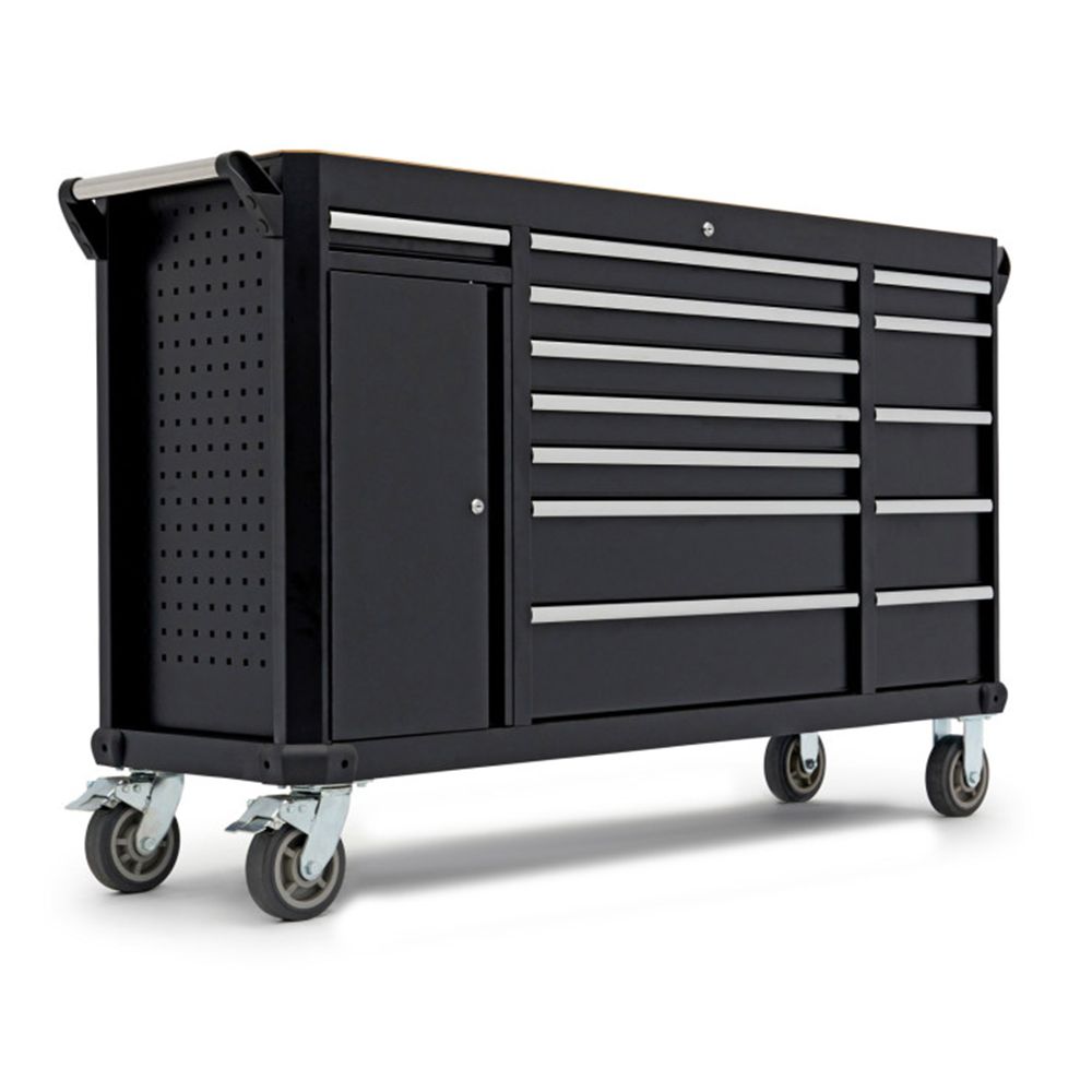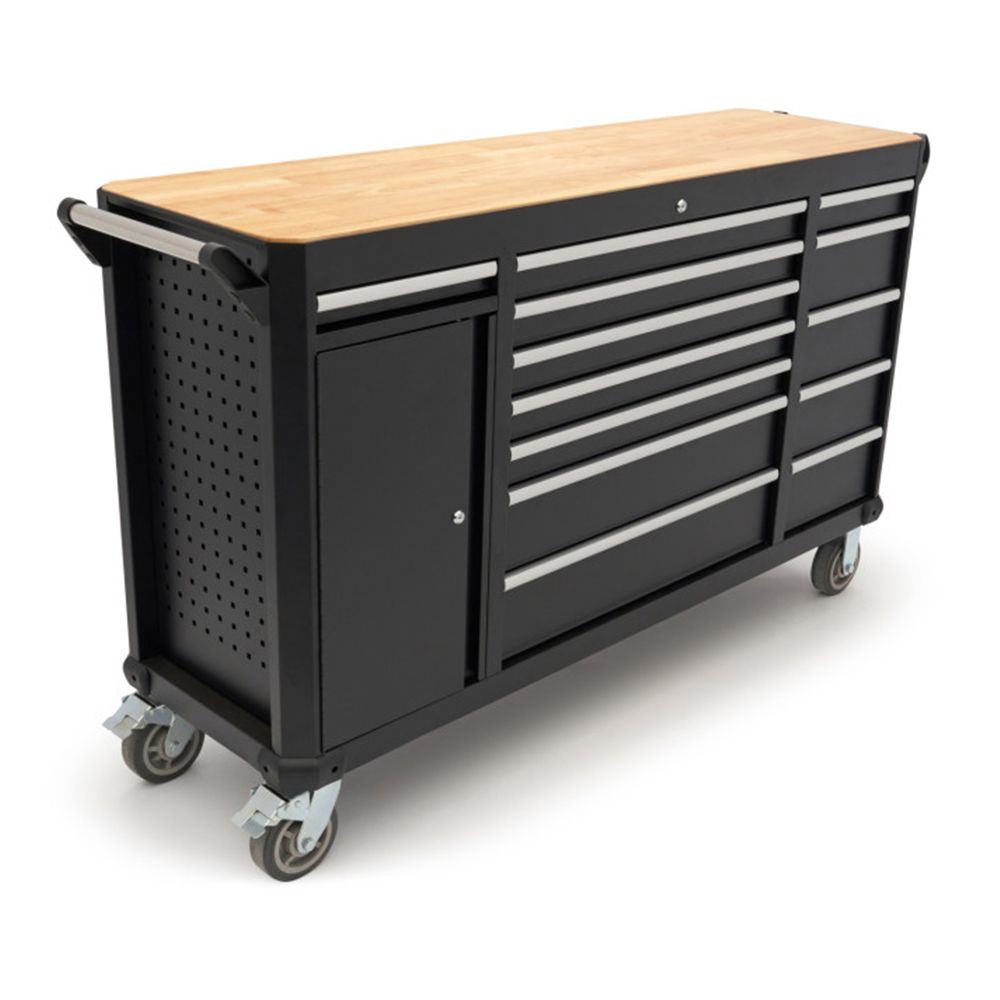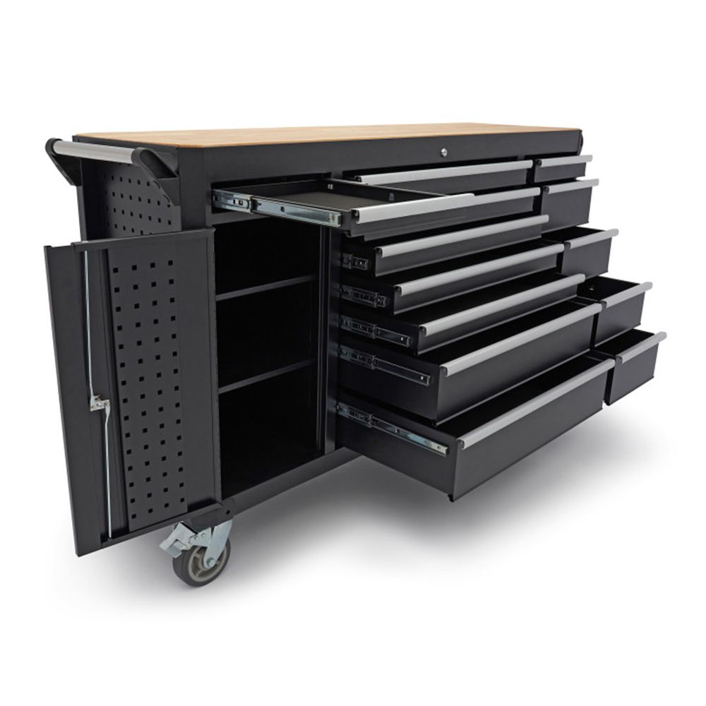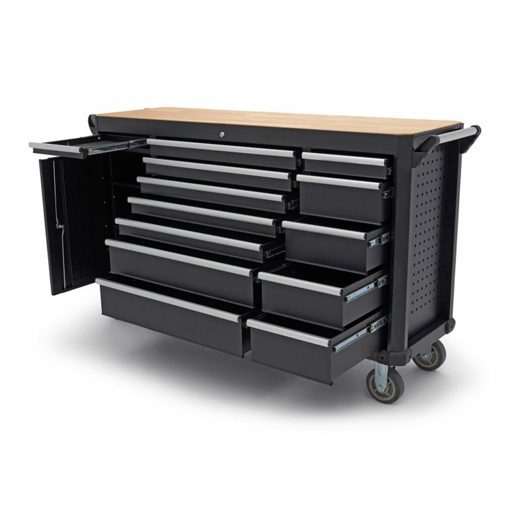 TENTO PRACOVNÝ STÔL TYPU VOZÍK S 13 ZÁSUVKAMI A DREVENOU DOSKOU 168 CM HBM kombinuje užitočnosť a štýl v každej dielni. Stôl je ideálny na uskladnenie náradia a dielov, na čo slúži 13 zásuviek rôznych rozmerov. Zásuvky sa pohybujú na pevných koľajniciach s guľôčkovými ložiskami. Kolieska sú mimoriadne odolné a každé unesie až 150 kilogramov.