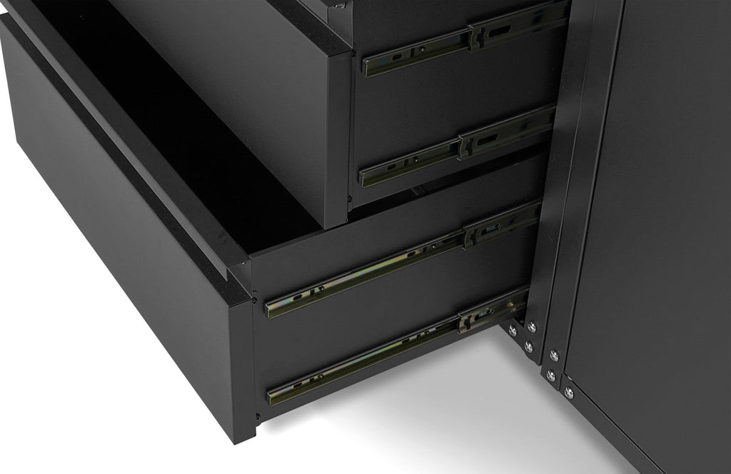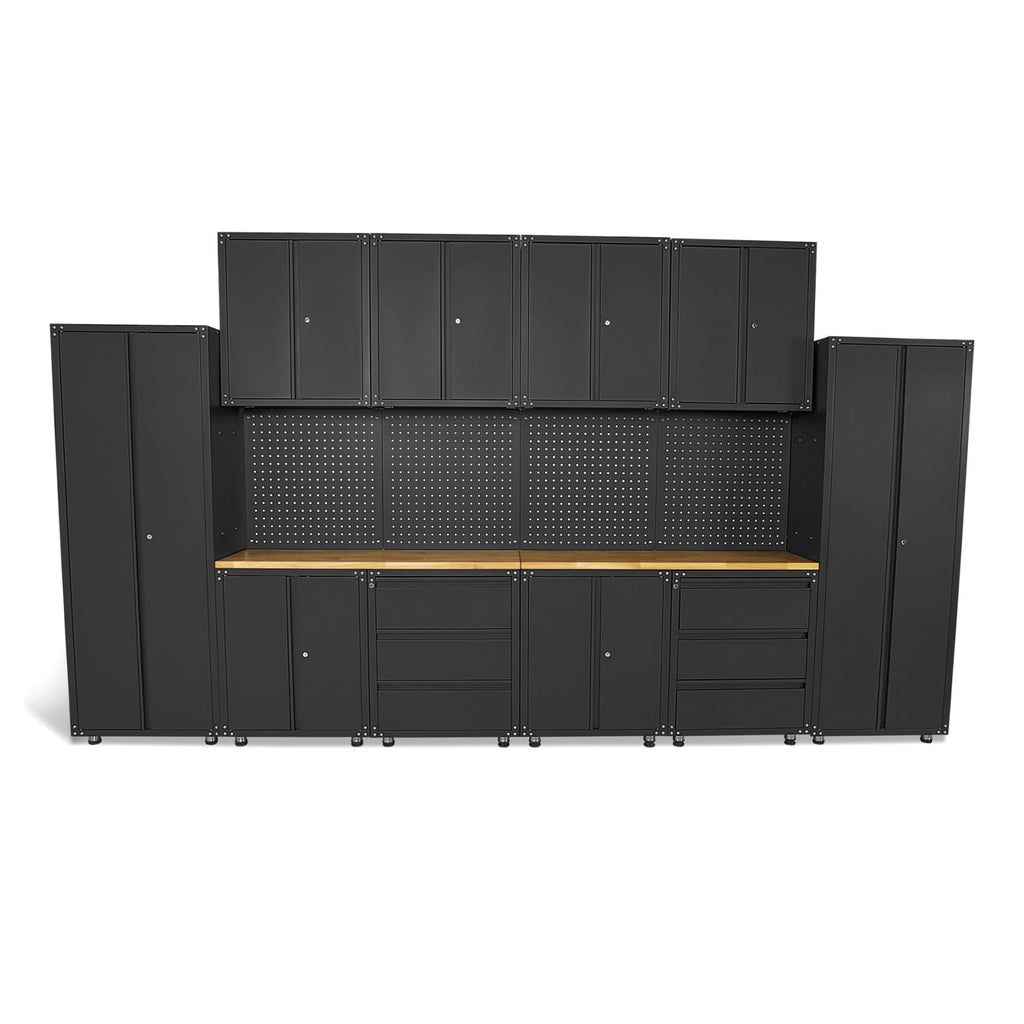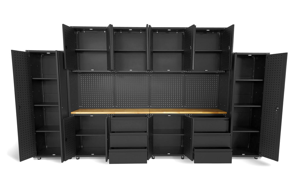Modulárny kovový nábytok do dielne, prémiová zostava s pracovným stolom 236,5 x 402 x 48,2cm, matná čierna, 16 dielov HBM Machines