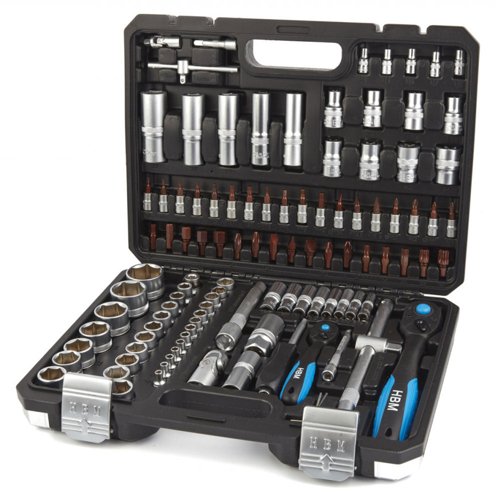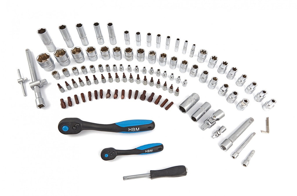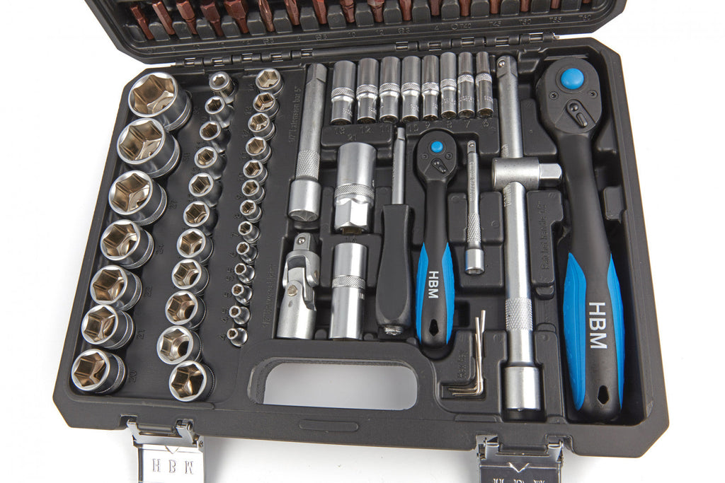 PREMIUM SADA NÁŘADÍ 1/4 1/2 108 KS HBM je vysoce kvalitní a obsahuje: Hlavice 18x 1/4" bity: rovné, Pozidrive, Philips, Torx a Torx s otvorem, 17 x nástrčné klíče 1/2" 10, 11, 12, 13, 14, 15, 16, 17, 18, 19, 20, 21, 22, 24, 27, 30, 32 mm, 8 x nástrčné klíče E1/2": E10, E11, E12, E14, E16, E18, E20, E24.