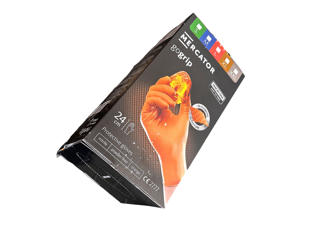 RUKAVICE Z NITRILU PREMIUM MERCATOR GOGRIP ONE BY ONE ORANŽOVÉ, VEĽKOSŤ L, SADA 100 KS sú navrhnuté pre profesionálnu ochranu proti chemickým látkam a mikroorganizmom. Vyrobené z vysokokvalitného nitrilu, tieto rukavice sú jednorazové, nesterilné, bez púdre a vhodné na použitie v náročnom prostredí. Vďaka ambidextrickému tvaru a okraju na uchopenie sa ľahko prispôsobia obom rukám a poskytujú pohodlie počas nosenia. Textúrovaný vonkajší povrch v tvare kosoštvorcov zabezpečuje pevný úchop aj za vlhkých alebo klzkých podmienok, zatiaľ čo chlórovaný vnútorný povrch uľahčuje rýchle nasadenie.
